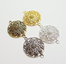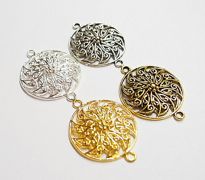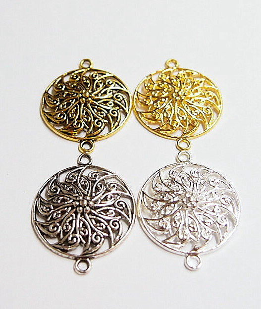 You are buying 4 Colors of Round Floral Connectors. You will receive one each Antique Gold, Gold, Antique Silver & Silver, these are all Plated. These measure 39 mm x 31 mm including the loops at each end. The top & bottom have a nice size loop (2.8 mm) for your Chain or Cord or Jump Ring (which I have 3 Colors & 2 Sizes of). These are very ornate & intricate. These can be used by themselves or as connectors to make your piece even more stunning. These will help you start or finish any project you have. I have lots of Great Bails, Bracelets, Cameos, Chains, Connectors, Jump Rings, Lockets, Pendants, Pins, Rings & Settings so, just look at all my listings. All of these are offered in groups of 4 of each Color.