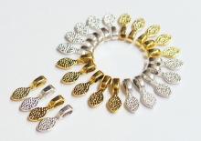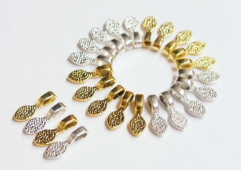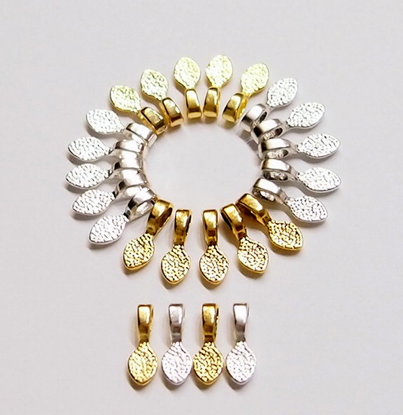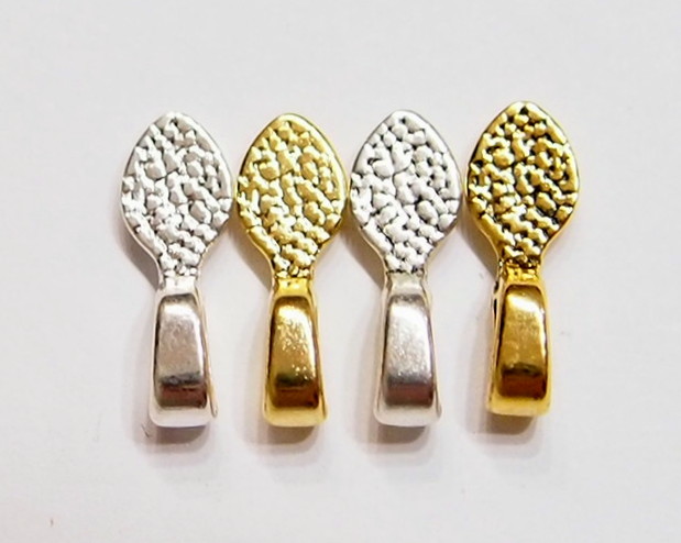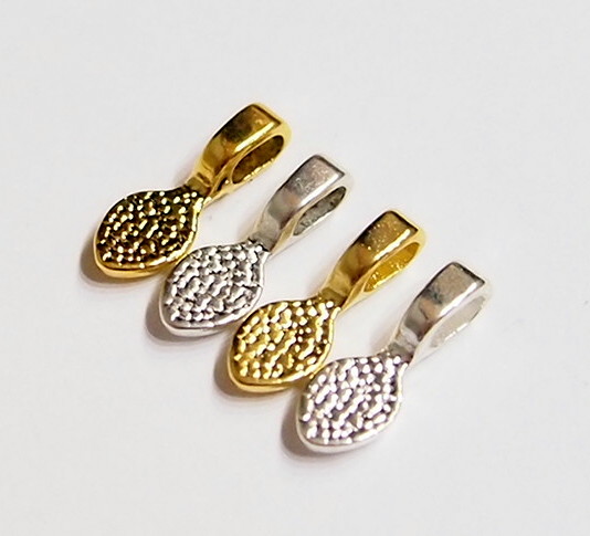 You are buying 4 different Colors of Small Oval Shaped Glue on Bails, these are perfect for Jewelry Making, 5 of each Color, 20 total. You will receive 5 each Antique Gold, Gold, Antique Silver & Silver, these are all Plated. These are all Oval shaped. These will help you start or finish any project you have. These measure 15 mm long x 5 mm wide with a nice loop that is 4.2 mm x 2.2 mm that will fit most any chain or cord. You can glue small items such as glass or bottle lids or just glue these to a Cameo or Cab & have a quick & easy ready to wear pendant. I have lots of Great Bails, Bracelets, Cameos, Chains, Connectors, Jump Rings, Lockets, Pendants, Pins, Rings & Settings so, just look at all my listings. These are all offered in groups of 20 of each color and are sold separately. The antique gold is item #361139288211, the shiny gold is item #360471676472, the antique silver is item #360487978696, and the shiny silver is item #110951837780. Also offered is a group of 21 Different Glue Bails in 6 Styles & 4 Colors as shown in the next to last picture item #110911244722 also sold separately. I also have pinch bails in 4 Colors & 3 sizes and in a group of 4 Colors with 5 of each of the 4 Colors for a total of 20 item #361461307483 as shown in the last picture and are also sold separately.