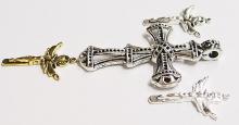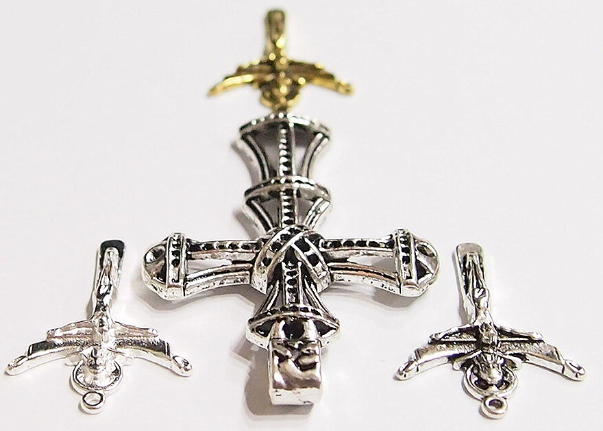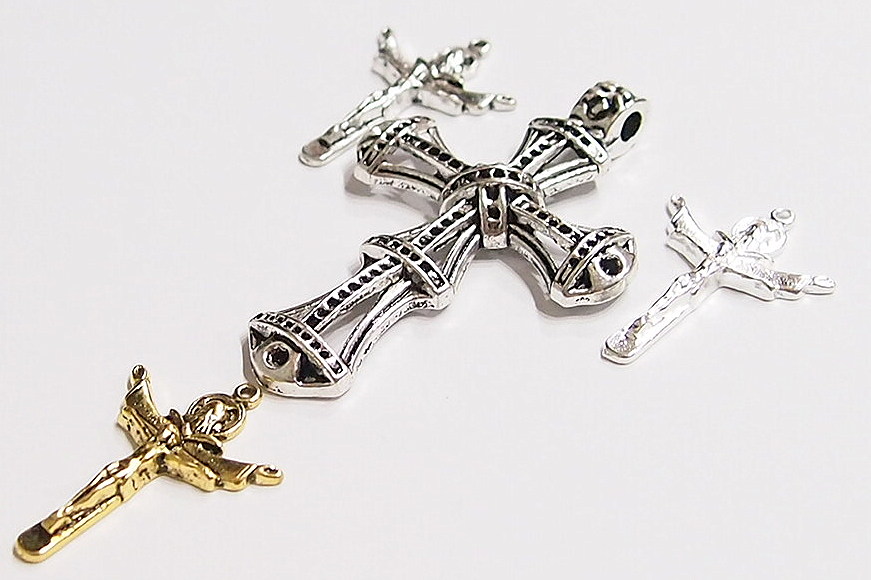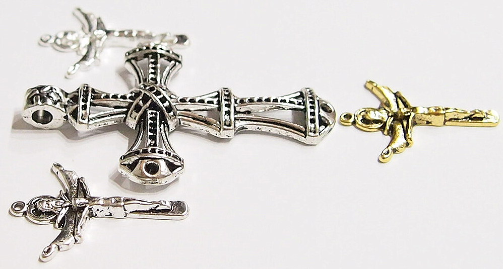 You are buying 4 Cross pendants, two of these (the large one & one of the small ones are antique silver plated), the other two small ones are shiny silver & antique gold plated, these are very nice. The large cross measures 65 mm x 42 mm with 4 places for crystals and has a nice large hole in the top for your chain or cord. These are all very sturdy. The Large Antique Silver cross is very ornate with lots of scroll work and the three small ones are Crucifixes of God standing behind Jesus on the Cross with his arms reaching out. The three small ones measure 34 mm x 25 mm. They are all great quality. These are all ready to wear. I have lots of Great Bails, Bracelets, Cameos, Chains, Connectors, Jump Rings, Lockets, Pendants, Pins, Rings & Settings so, just look at all my listings. These are all offered in groups of 4 of each color except for the large one. The antique silver is item #788358735843, antique gold is item #786651938216, and the shiny silver plated is item #363026918502. The largest one in the middle is offered in a group of 2 item #72319795482. All 3 of the small Crosses are offered in a group of 3 as shown in the last picture item #847972733777, sold separately.