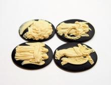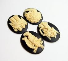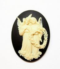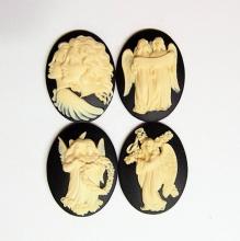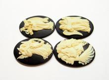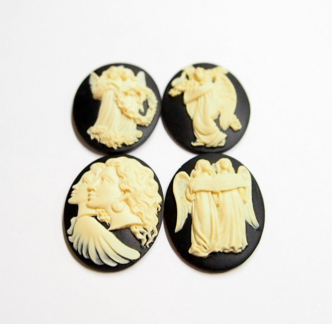 You are buying 4 Different 40 mm x 30 mm Cream over Black Angel Resin Cameos. These are so gorgeous, all show a different Angel or Angels in a Cream over Black background. One is two Angels holding a beautiful Heart Wreath. Another is two angels holding a scroll singing with angel wings spread. There is one angel carrying a cross. Another is a pair of angels posed from the side with wings. Exactly what you see is what you will receive. The details are very sharp and stand away from the background, giving them all a 3-D effect. The molding process of these are just great, no flaws. These are all pretty fabulous. I have lots of Great Bails, Bracelets, Cameos, Chains, Connectors, Jump Rings, Lockets, Pendants, Pins, Rings & Settings so, just look at all my listings. All of these are offered in groups of 4 of each. Starting with the top row left to right is the two angels holding a wreath is item #360495581818, the angel carrying a cross is item #110911248686, bottom row is the two angels item #360478420758 and the two angels singing is item #360478420812. Three of these cameos are also offered in a group of 10 different Angel 40x30 mm Cameos item #360601358717 as shown in the last picture, sold separately.