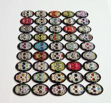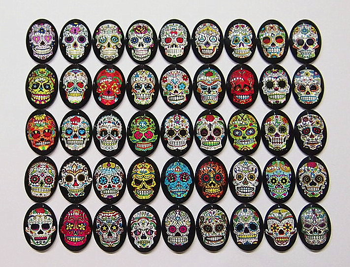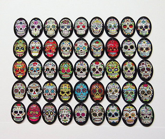 You are buying 45 Different 25 mm x 18 mm Glass Skull Head Cameos. These are amazing in all the different Colors & configurations of skull heads you will receive. These are really nice. Each one is different and has all kinds of details in every cameo. These measure 25x18 mm. I have several different settings these will fit in. They all look very detailed for their size. I have lots of Great Bails, Bracelets, Cameos, Chains, Connectors, Jump Rings, Lockets, Pendants, Pins, Rings & Settings so, just look at all my listings. I have several other Glass Cameos in two different sizes so give them all a look.