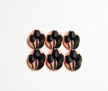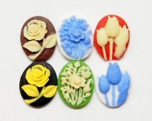 You are buying 6 of 10 mm x 8 mm Black over Peach Three Tulips Cameos. These are so gorgeous, this shows a three beautiful Tulips. The tulips are Black on a peach background. This is a very nice color combination. The molding process of these are just great, no flaws. I have several different settings these will fit in. They look very detailed for their size. I have lots of Great Bails, Bracelets, Cameos, Chains, Connectors, Jump Rings, Lockets, Pendants, Pins, Rings & Settings so, just look at all my listings. I have these in 2 other Colors & in a group of 6 Colors as shown in the last picture item #110911253395.
