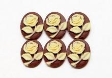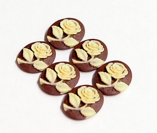 You are buying 6 of 10 mm x 8 mm Cream over Brown Perfect Single Rose Cameos. These are so gorgeous, this shows a single Rose on a Cream over Brown background. This is a very nice color combination. The molding process of these are just great, no flaws. I have lots of Great Bails, Bracelets, Cameos, Chains, Connectors, Jump Rings, Lockets, Pendants, Pins, Rings & Settings so, just look at all my listings. I have these in 1 other Colors & in a group of 6 Colors as shown in the last picture item #110911253395.