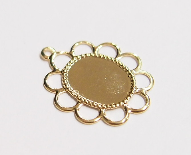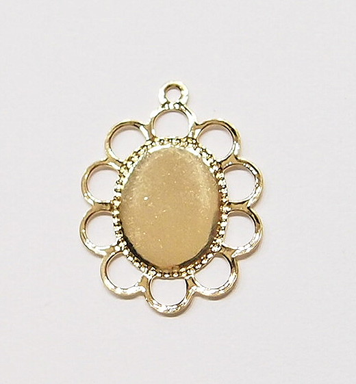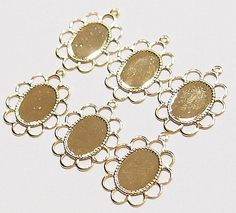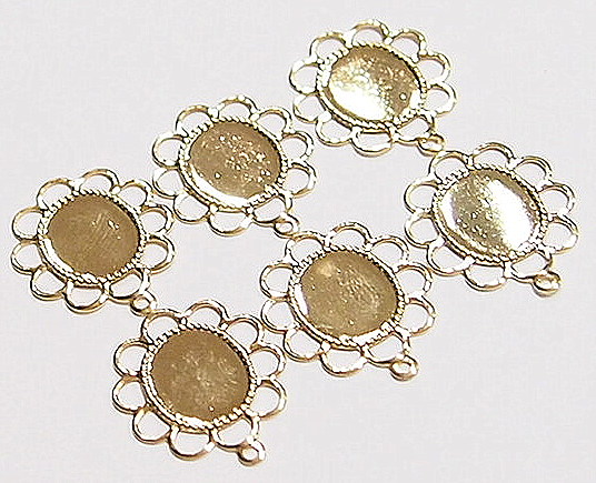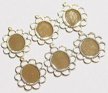 You are buying 6 of 10 mm x 8 mm Shiny Gold Plated Flower Shaped Pendant or Earring or Charm Settings, these are Glue in setting, no prongs. You can put a jump ring (which I have 3 Colors & 2 Sizes of) to make it a small pendant or to make earrings out of them. The overall dimensions are 18 x 15 mm including the loop at the top. The top has a small loop (1 mm) for your Chain or Jump Ring (which I have 3 Colors & 2 Sizes of) or Earring post.The back is the same as the front. These have never been used. These are exactly made for 10x8 mm, with these having a solid back these would be great as you could put something smaller in the setting. I have lots of Great Bails, Bracelets, Cameos, Chains, Connectors, Jump Rings, Lockets, Pendants, Pins, Rings & Settings so, just look at all my listings. I also have these in Silver Plated item #110911244736.