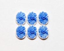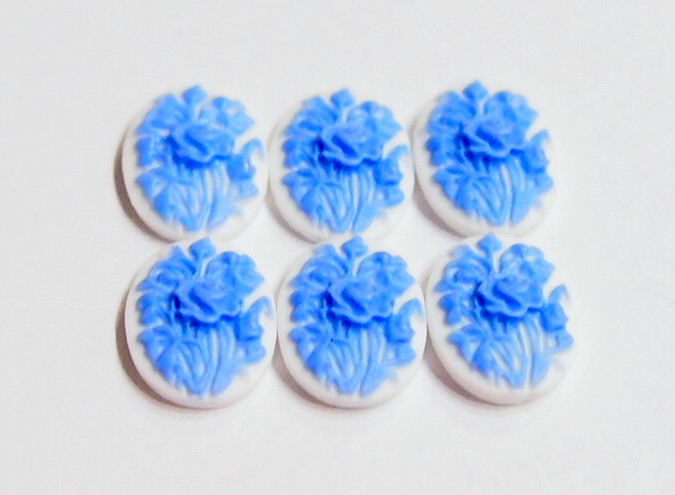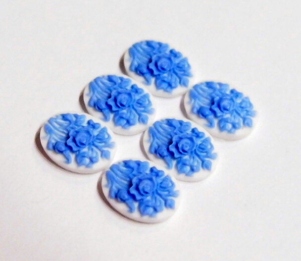 You are buying 6 of 10 mm x 8 mm Blue over White Wild Roses Cameos. These are so gorgeous, this shows a cluster of Wild Roses. The flowers are Blue on a White background. This is a very nice color combination. The molding process of these are just great, no flaws. I have several different settings these will fit in. They look very detailed for their size. I have lots of Great Bails, Bracelets, Cameos, Chains, Connectors, Jump Rings, Lockets, Pendants, Pins, Rings & Settings so, just look at all my listings. I have these in 1 other Color & in a group of 6 Colors as shown in the last picture item #110911253395.