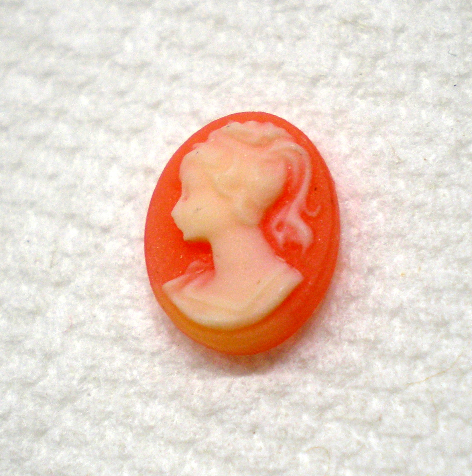 You are buying 6 Very Small Cameos. They are of a beautiful Girl with a small ponytail facing Left. These would be great in any 10 mm X 8 mm settings that I have listed. They are a Cream color on a Carnelian background. They look very detailed for their size. I have lots of great cameos, settings, connectors and pendants so, just look at all my listings.