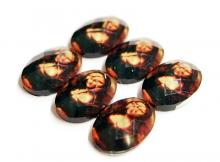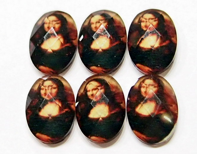 You are buying 6 Acrylic Cameos. They are of a Mona Lisa portrait, the cameo is just like the painting, except, it is faceted on all sides, which made taking a picture impossible, it would catch any light and reflect it, the picture is sorry, but the cameo is pretty nice, the faceted sides just make it different. It does give you that 3-D effect. They measure 14 mm x 10 mm. This would look great in earring, bracelets, pin and rings. I have lots of great cameos, settings, connectors and pendants so, just look at all my listings.