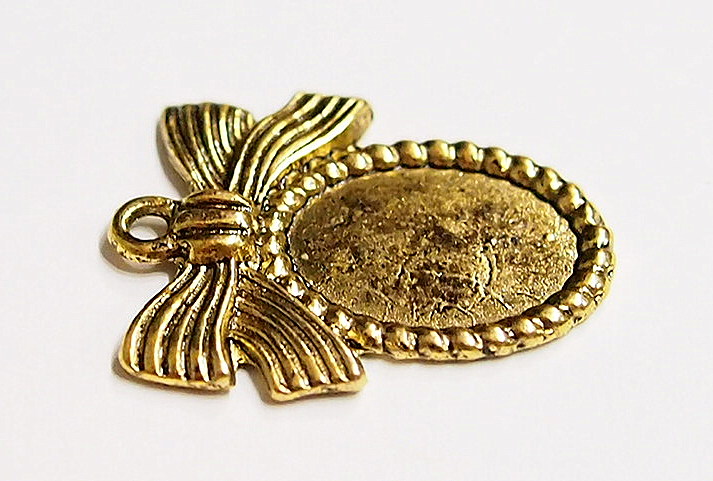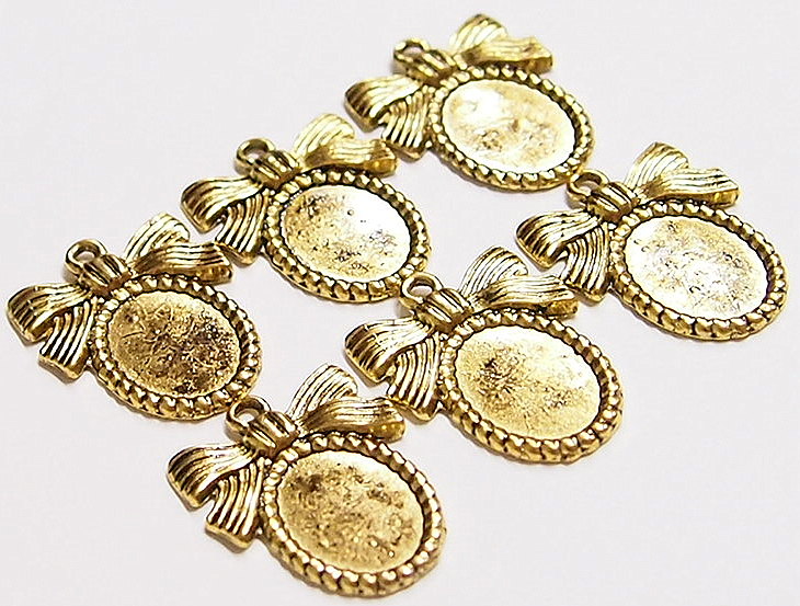 You are buying 6 of 14 mm x 10 mm Antique Gold Plated Ribbon & Bow Design Pendant Settings. What makes these so nice is that there is a Tied Ribbon Bow on top of them, these will be great for cameos, cabochons, or even charm settings. You will have to glue in any cameos or cabochons you want to put into the setting, no prongs and they are very sturdy. The top has a nice size loop (2 mm) for your Chain or Cord or Jump Ring (which I have 3 Colors & 2 Sizes of). These have never been used. They look very detailed for their size. I have lots of Great Bails, Bracelets, Cameos, Chains, Connectors, Jump Rings, Lockets, Pendants, Pins, Rings & Settings so, just look at all my listings. I have these in 3 other Colors & in a group of 4 Colors as shown in the next to last picture item #360478422127, sold separately. These are also offered in a group of 29 different 14x10 mm settings as shown in the last picture item #110911244707, sold separately.