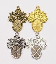 You are buying 6 of 14 mm x 10 mm Antique Gold Plated Rose Pendant Settings. The outside dimensions are 32x24 mm including the loop at the top. The top has a nice size loop (2.3 mm) for your Chain or Cord or Jump Ring (which I have 3 Colors & 2 Sizes of). These are just a gorgeous design with 3 beautiful roses at the top, really a special setting for cameos, cabs, or charms settings. You will have to glue in any cameos or cabs you want to put into the setting, no prongs and they are very sturdy. These have never been used. I have lots of Great Bails, Bracelets, Cameos, Chains, Connectors, Jump Rings, Lockets, Pendants, Pins, Rings & Settings so, just look at all my listings. I have these in 3 other Colors & in a group of 4 Colors as shown in the next to last picture item #414x10. I also offer a group of 29 different 14x10 settings in 4 Colors item #110911244707 as show in the last picture.