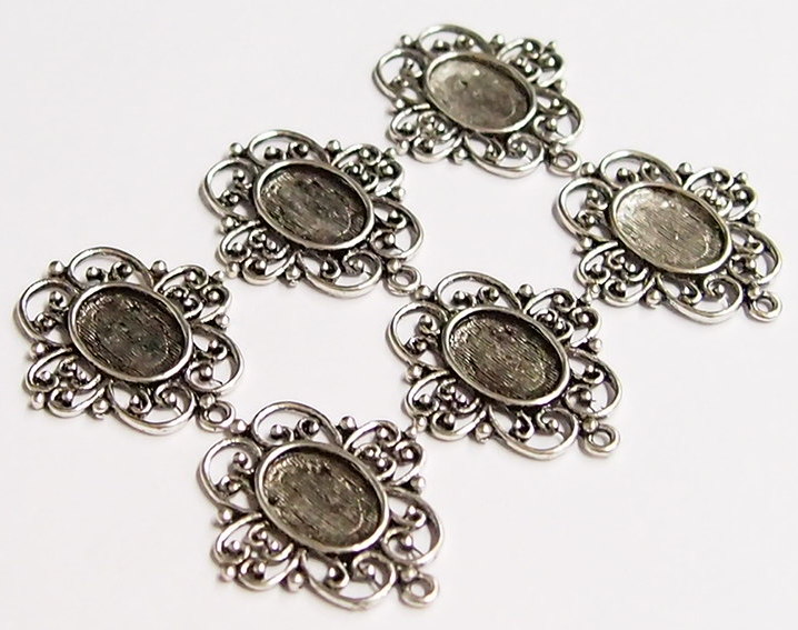 You are buying 6 of 14 mm x 10 mm Antique Silver Plated Flower Design Pendant Settings. This is a gorgeous setting & the pattern is a flowery design and is going to accent any cameos or cabs you put in it. You will have to glue in any cameos or cabs you want to put into the setting, no prongs and they are very sturdy. The top has a nice size loop(1.9 mm) for your Chain or Cord or Jump Ring (which I have 3 Colors & 2 Sizes of). These have never been used. They have a gorgeous Victorian look to them. I have lots of Great Bails, Bracelets, Cameos, Chains, Connectors, Jump Rings, Lockets, Pendants, Pins, Rings & Settings so, just look at all my listings. I have these in 3 other Colors & in a group of 4 Colors as shown in the last picture item #110911242492, sold separately.