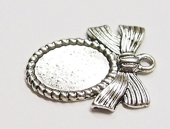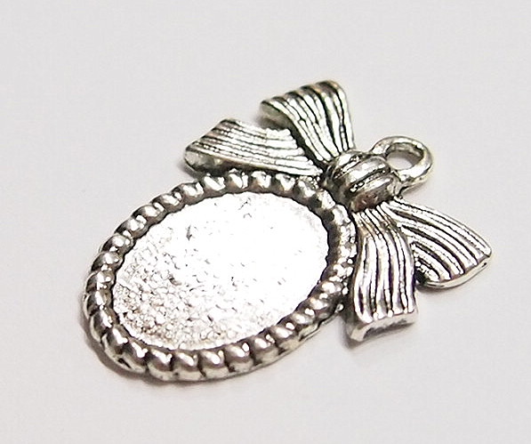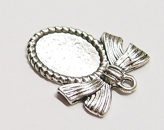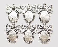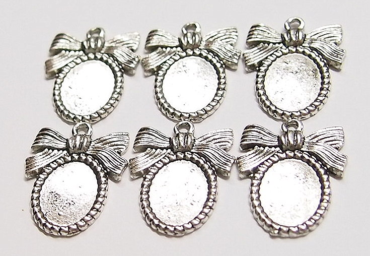 You are buying 6 of 14 mm x 10 mm Antique Silver Plated Ribbon & Bow Design Pendant or Charm Settings. What makes these so nice is that they have a very cute ribbon & bow on top of each one, these will be great in charms or for cameos or cabochon setting. You will have to glue in any cameos or cabs you want to put into the setting, no prongs and they are very sturdy. The top has a nice size loop (2.2 mm) for your Chain or Cord or Jump Ring (which I have 3 Colors & 2 Sizes of). These have never been used. They look very detailed for their size. I have lots of Great Bails, Bracelets, Cameos, Chains, Connectors, Jump Rings, Lockets, Pendants, Pins, Rings & Settings so, just look at all my listings. I have these in 3 other Colors & in a group of 4 Colors as shown in the next to last picture item #360478422127, sold separately. These are also included in a group of 29 different 14x10 mm settings as shown in the last picture item #110911244707, sold separately.