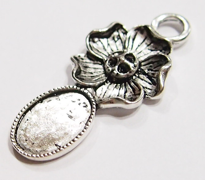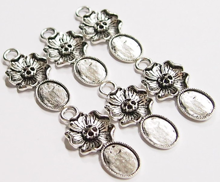 You are buying 6 of 14 mm x 10 mm Antique Silver Plated with a Sunflower Pendant Settings. What makes these so unusual is that there is a sunflower above the cameos or cabs settings. You will have to glue in any cameos or cabs you want to put into the setting, no prongs and they are very sturdy. The pendant has a loop at the top you can put your chain or cord through. These have never been used. I have lots of Great Bails, Bracelets, Cameos, Chains, Connectors, Pendants, Pins, Rings & Settings so, just look at all my listings.