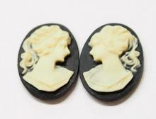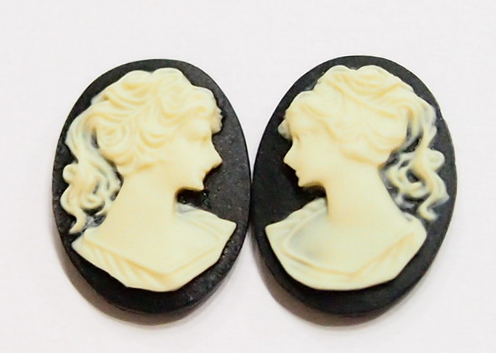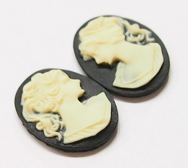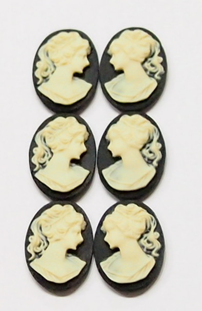 You are buying 6 of 14 mm x 10 mm Cream over Black Classic Ponytail Woman Cameos, Left & Right Facing. They are of Beautiful woman with a small wisp of hair hanging down in the back, she is the classic woman cameo, so often seen. You will receive 3 left Facing and 3 right Facing. These are cream color over a black background. They measure 14 mm x 10 mm. This would look great in earring, bracelets, pins and rings. I have lots of Great Bails, Bracelets, Cameos, Chains, Connectors, Jump Rings, Lockets, Pendants, Pins, Rings & Settings so, just look at all my listings. I have these in 2 other Colors & in a group of 3 Colors as shown in the last picture item #110930807370, sold separately. I have several other Cameos in this size & lots of choices in many other sizes.