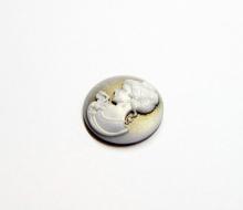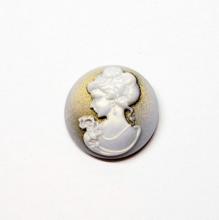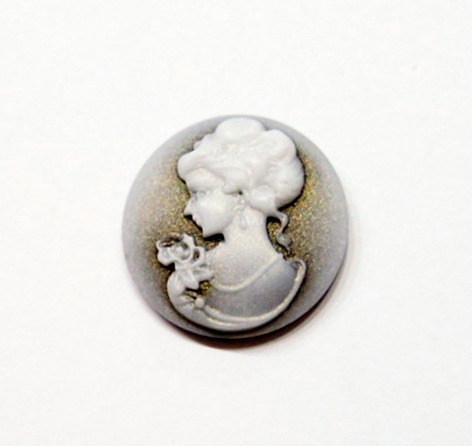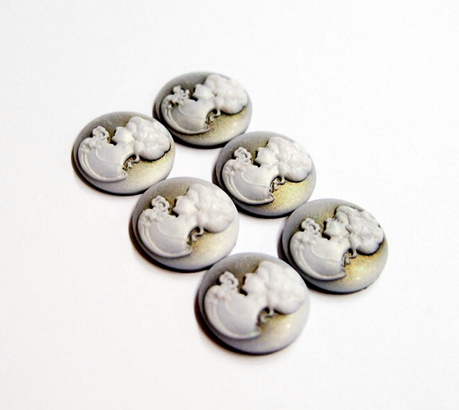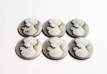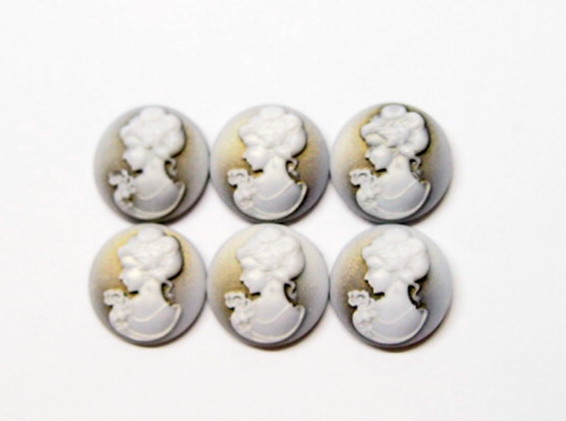You are buying 6 of 18 mm Round White with Silver with Gold Victorian Ponytail Lady Cameos. They are of a Gorgeous Victorian Woman facing Left. The color of these is what is so different, she is white on a silver background with a little tint of gold, just like the picture, a very unusual background. These measure just barely over 17 mm round so I have them listed here under 18 mm. They look very detailed for their size, in fact, she stands out from the background to give it a 3-D look. I have lots of Great Bails, Bracelets, Cameos, Chains, Connectors, Jump Rings, Lockets, Pendants, Pins, Rings & Settings so, just look at all my listings. I have several other round cameos in lots of colors and styles so give them all a look.