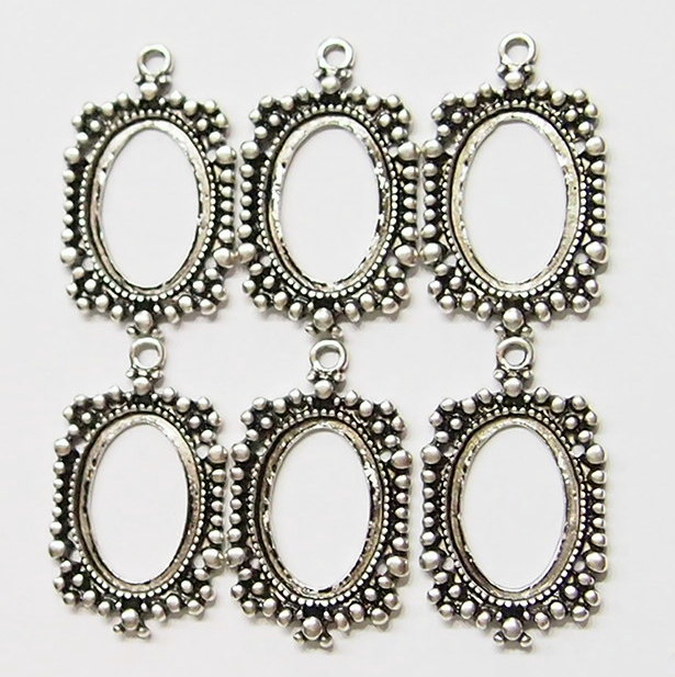 You are buying 6 of 18 mm x 13 mm Antique Silver Plated Beaded Pendant or Charm Settings. The top has a nice size loop (2.3 mm) for your Chain or Cord or Jump Ring (which I have 3 Colors & 2 Sizes of). You will have to glue in any cameos or cabochons you want to put into the setting, no prongs and they are very sturdy. These will hold 18 mm x 13 mm cabs or cameos. These have never been used. These are exactly made for 18 mm x 13 mm. Everything is solidly made. They have a gorgeous Victorian look to them. I have lots of Great Bails, Bracelets, Cameos, Chains, Connectors, Jump Rings, Lockets, Pendants, Pins, Rings & Settings so, just look at all my listings. I have these in 3 other Colors & in a group of 4 Colors as shown in the last picture item #111437437696, sold separately.