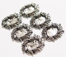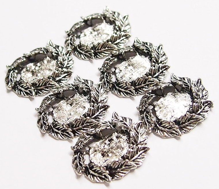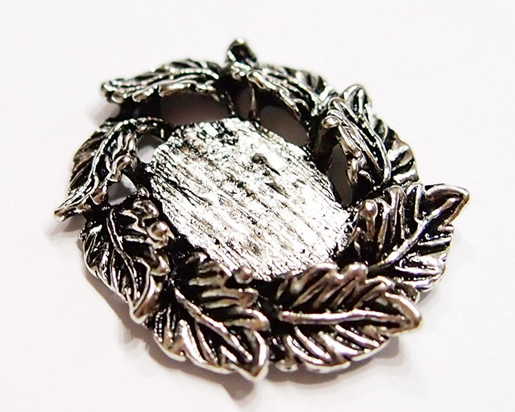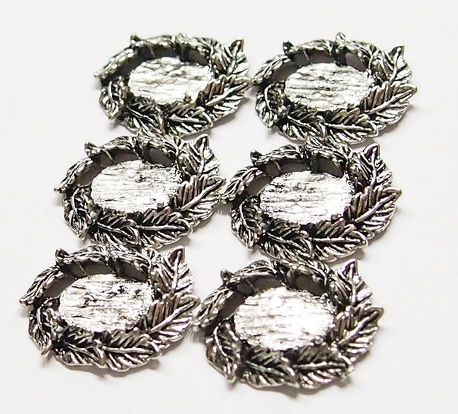 You are buying 6 of 18 mm x 13 mm Antique Silver Plated Leaf Wreath Pendant Settings. They are simply gorgeous, they have a very Victorian look to them with big leaves surrounding it like a wreath, quite beautiful. The top & sides have a slit through to the back for your Chain or Cord or Jump Ring (which I have 3 Colors & 2 Sizes of). The cameos or cabs will need to be glued in. You can use these Horizontal or Vertical. The design is just delicate, but they are very solid, not flimsy like the new ones are. You will not be disappointed in the quality, it is excellent and if I was setting any cameos or cabs, I would use these. I have lots of Great Bails, Bracelets, Cameos, Chains, Connectors, Jump Rings, Lockets, Pendants, Pins, Rings & Settings so, just look at all my listings. I have these in 3 other Colors & in a group of 4 Colors as shown in the last picture item #111347909726.