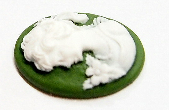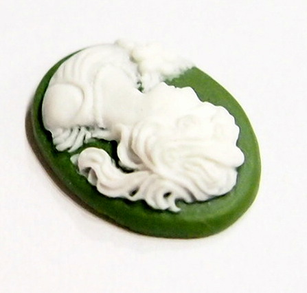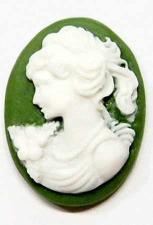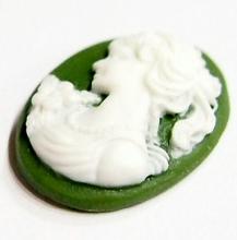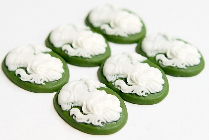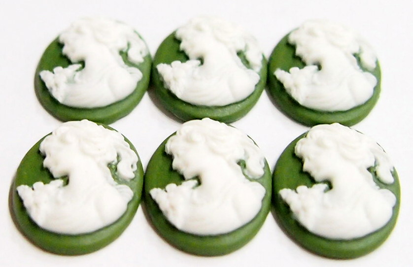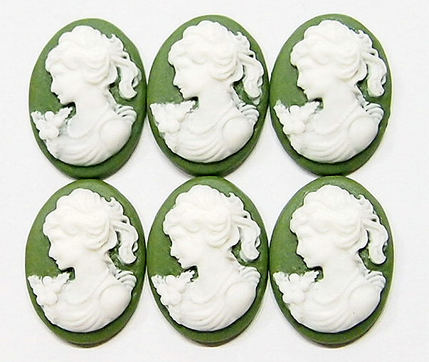You are buying 6 of 18 mm x 13 mm White over Green, with a Corsage & Ponytail Cameos, Left Facing. They are of a beautiful Victorian woman with a small ponytail & wearing a corsage and she is facing Left. These would be great in any of the many 18 mm x 13 settings I sell. They are a white color on a green background. They look very detailed for their size. I have lots of Great Bracelets, Connectors, Cameos, Pendants, & Settings so, just look at all my listings.