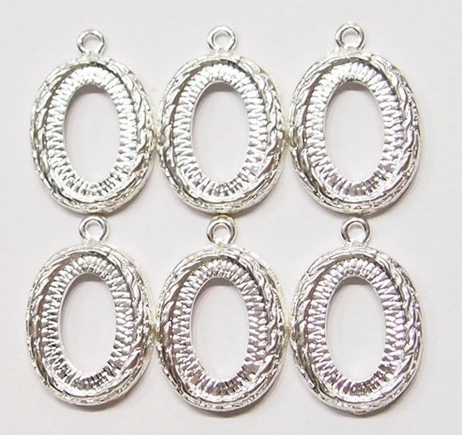You are buying 6 of 18 mm x 13 mm Shiny Silver Victorian Wreath Pattern Plated Pendant Settings. They are simply gorgeous, they have a very Victorian look to them with a small wreath around it, quite beautiful. The design is just delicate, but they are very solid, not flimsy like the new ones are. You will not be disappointed in the quality, it is excellent and if I was setting any cameos or cabs, I would use these. The cameos or cabs will need to be glued in. I have lots of Great Bails, Bracelets, Cameos, Chains, Connectors, Pendants, Pins, Rings & Settings so, just look at all my listings. I have these in 3 other Colors & in a group of 4 Colors item #111390752529 as shown in the last picture.