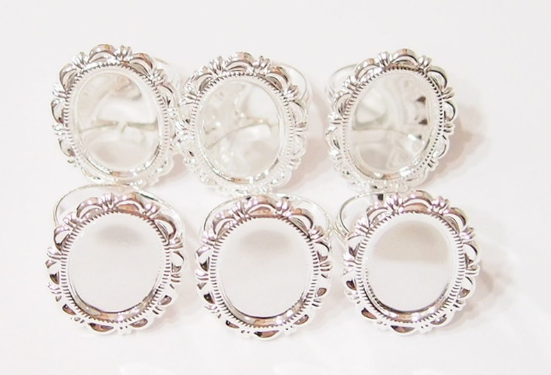 You are buying 6 of 18 mm x 13 mm Shiny Silver Plated Adjustable Closed Loop Scalloped Ring Settings. These have a very nice closed loop with a scalloped design. These adjust under the settings so you never see the adjustment, very nice. They have a gorgeous Victorian look to them. You will have to glue in any cameos, cabochons, glass, or whatever you want to put into the setting, no prongs and they are very sturdy. Even though this is an adjustable band, everything is really sturdy and well made. These have never been used and are all new. These are exactly made for 18 mm x 13 mm, but with this being a solid backing, you can go down a little on the size is you have an odd size cameo or cab you are trying to fit. I have lots of Great Bails, Bracelets, Cameos, Chains, Connectors, Jump Rings, Lockets, Pendants, Pins, Rings & Settings so, just look at all my listings. I have these in 3 other Colors & in a group of 4 Colors as shown in the third from last picture item #360471680384, sold separately. I have bracelets in 4 Colors in 40x30 mm with this same pattern item #111340182534 as shown in the next to last picture, sold separately. I also offer earrings with this pattern in 18x13 mm in antique silver as shown in the last picture item #110911248602, sold separately.