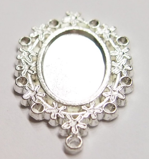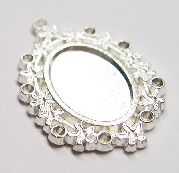 You are buying 6 of 18 mm x 13 mm Oval Shiny Silver plated Pendant Settings. You will have to glue in any cameos or cabs you want to put into the setting, no prongs and they are very sturdy. The top has a nice size loop(2 mm) for your Chain or Cord or Jump Ring(which I have 3 Colors & 2 Sizes of). There are 8 places that can take very small crystals or stones or you can leave like they are, Gorgeous. These are really a quality pendant setting to be used. This will hold 18 mm x 13 mm cabs or cameos, and the outside measures 35 mm x 25 mm. These have never been used. These are exactly made for 18 mm x 13 mm, but with this being a solid backing, you can go down a little on the size is you have an odd size cameo or cab to try and fit. Everything is solidly made. These were made off of old 1900's molds. They have a gorgeous Victorian look to them. These have a Cross scene on the back as shown in the pictures. I have lots of Great Bails, Bracelets, Cameos, Chains, Connectors, Jump Rings, Lockets, Pendants, Pins, Rings & Settings so, just look at all my listings. I have these in 3 other Colors & in a group of 4 Colors as shown in the last picture item #360786020992.