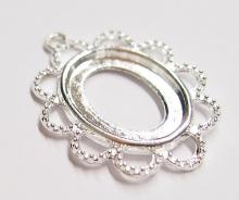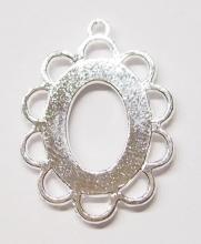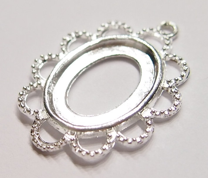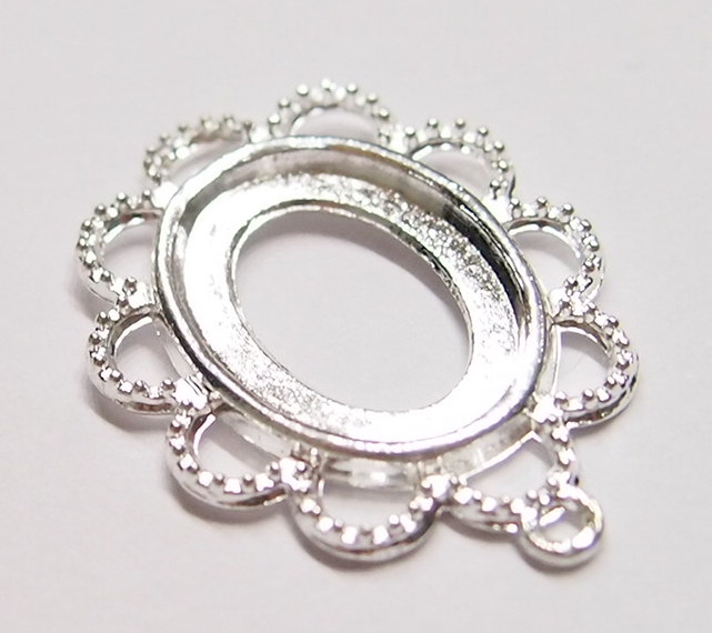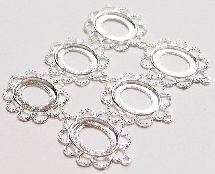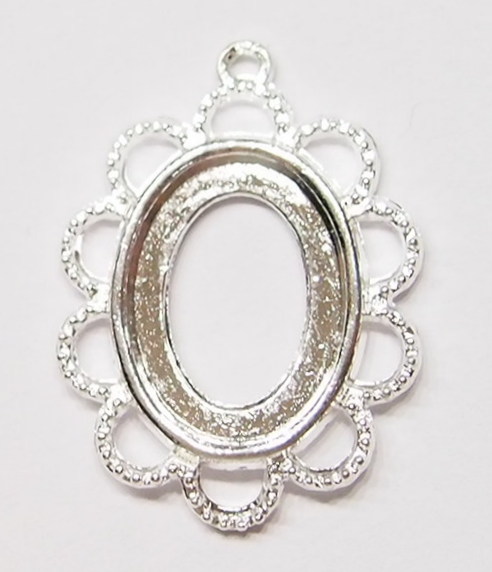 You are buying 6 of 18 mm x 13 mm Shiny Silver Plated Scalloped Rope Pendant Settings. These are really a quality pendant setting to be used. These will hold 18 mm x 13 mm cabs or cameos, the outside measures 31x23 mm including the loop at the top. The top has a nice size loop (1.3 mm) for your Chain or Jump Ring (which I have 3 Colors & 2 Sizes of). You will have to glue in any cameos or cabs you want to put into the setting, no prongs and they are very sturdy. These have never been used. These are exactly made for 18x13 mm. Everything is solidly made. These are lightweight & sturdy. They have a gorgeous Victorian look to them. I have lots of Great Bails, Bracelets, Cameos, Chains, Connectors, Jump Rings, Lockets, Pendants, Pins, Rings & Settings so, just look at all my listings. I have these in 3 other Colors & in a group of 4 Colors as shown in the last picture item #110911248636.