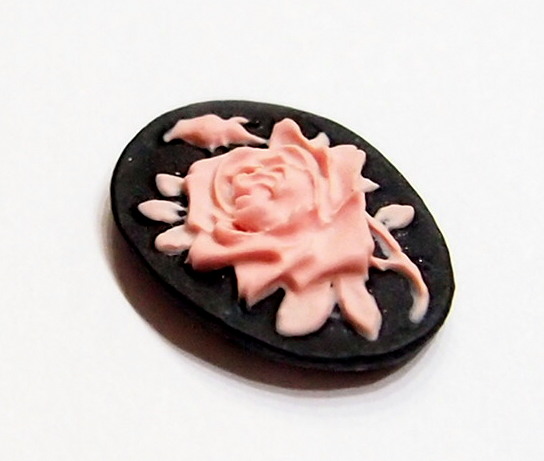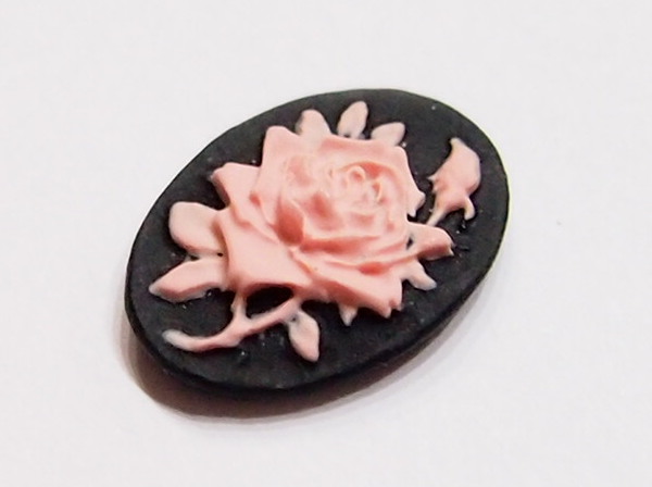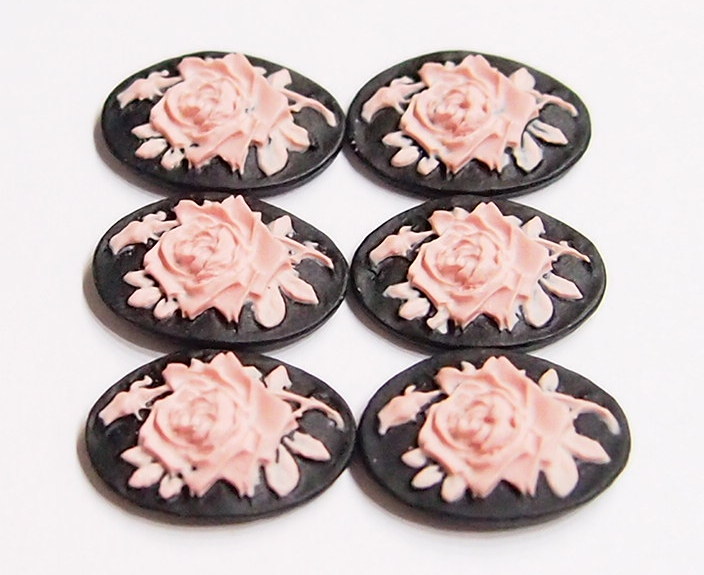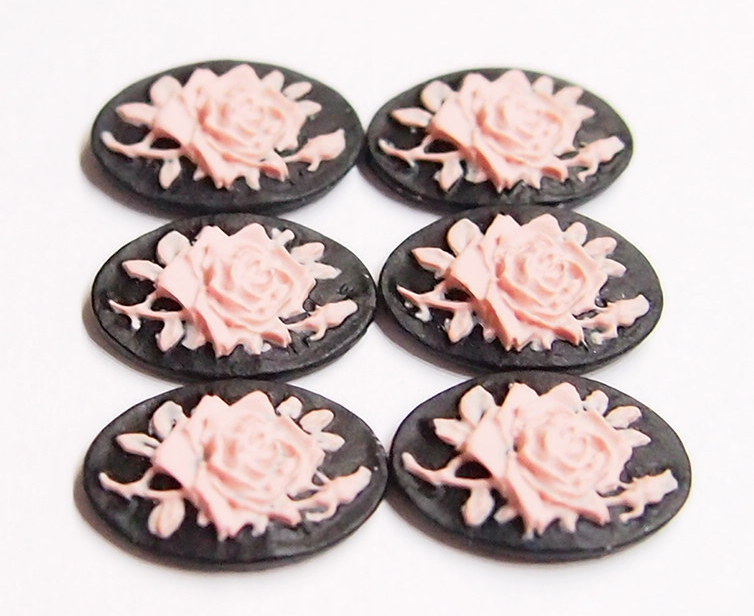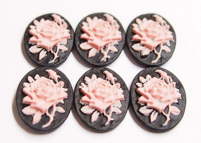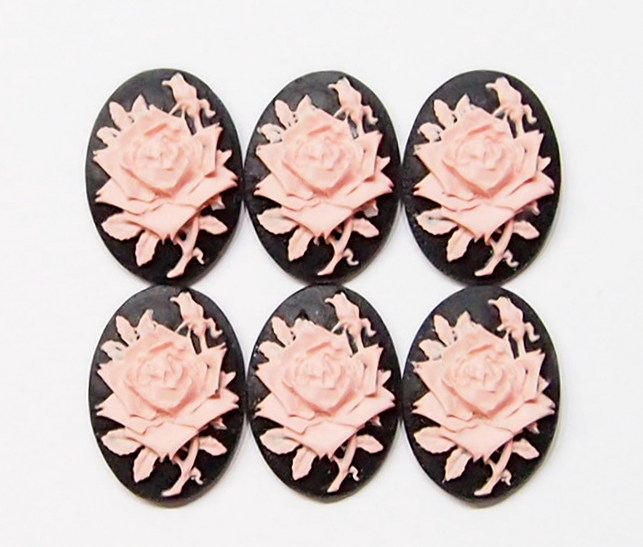 You are buying 6 of 18 mm x 13 mm Pink over Black Single Rose & Bud Cameos. These are so gorgeous, this shows a beautiful Rose with Bud and Leaves. The rose is gorgeous Pink on a black background. This is a very nice color combination. The Rose practically fills up the entire cameos by itself. The molding process of these are just great, no flaws. I have several different settings these will fit in. They look very detailed for their size. I have lots of Great Bails, Bracelets, Cameos, Chains, Connectors, Jump Rings, Lockets, Pendants, Pins, Rings & Settings so, just look at all my listings. I have these in 2 other Colors & in a group of 12 Colors as shown in the last picture item #111005686356, sold separately. I also have these in several Colors of 25x18 and 40x30 mm.