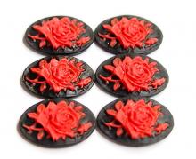 6 of 18x13 mm Red over Black Rose & Bud Motif Cameos, Nice