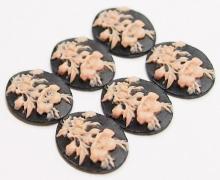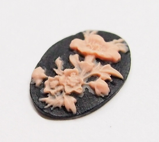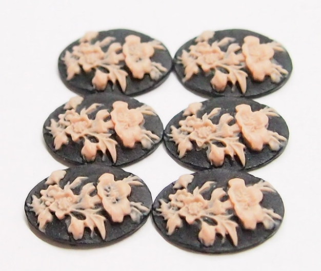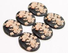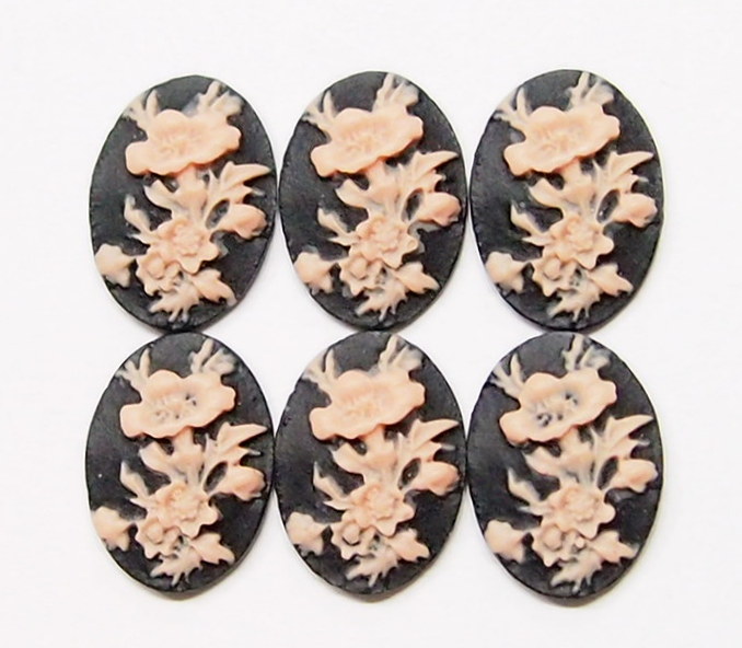 You are buying 6 Vintage 18 mm x 13 mm molded Resin Cameos. These are so gorgeous, this shows a sunflower and other small sunflowers below it. The sunflowers are Pink on a Black background. This is a very nice color combination. These measure 18 mm x 13 mm. The sunflowers practically fill up the entire cameos by itself. The molding process of these are just great, no flaws. I have several different settings these will fit in. They look very detailed for their size. I have lots of Great Bails, Bracelets, Cameos, Chains, Connectors, Pendants, Pins, Rings & Settings so, just look at all my listings.