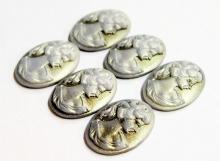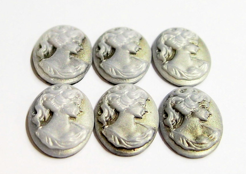 You are buying 6 of 18 mm x 13 mm Classic Lady with a Ponytail Cameos, White with Silver & Gold. They are of a Gorgeous Victorian Woman with a ponytail. The color of these is what is so different, she is white but on a silver background and under certain lights, it looks gold, just like the picture, very unusual background. These measure 18 mm x 13 mm. They look very detailed for their size, in fact, she stands out from the background to give it a 3-D look. I have lots of Great Bails, Bracelets, Cameos, Chains, Connectors, Pendants, Pins, Rings & Settings so, just look at all my listings. These are also offered in a group of 8 different colors as shown in the last picture item #360478422138, sold separately. I also have these in 25x18 mm & in a group of 10.