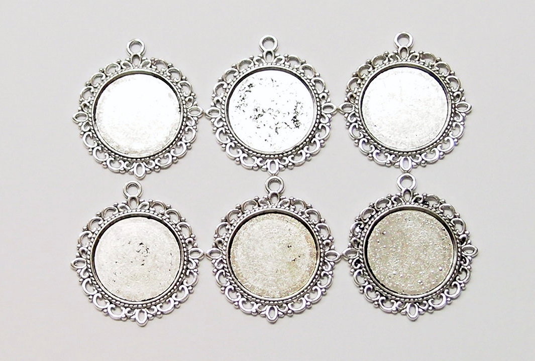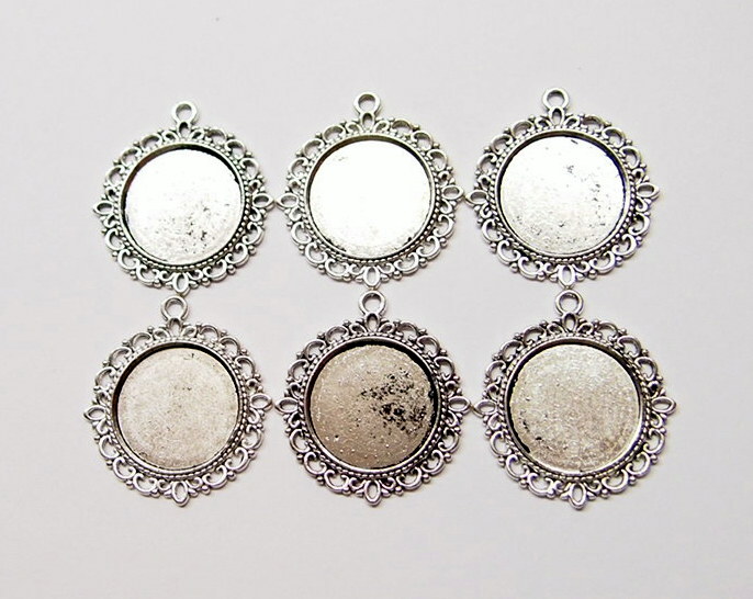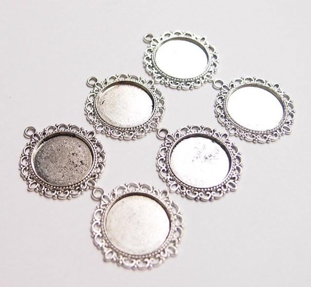 You are buying 6 of 20 mm Round Antique Silver Plated 4 Loops Pendant Settings. These are very well made and sturdy. You will not be disappointed in the quality, it is excellent and if I was setting any cameos or cabs, I would use these. The outside measures 30 mm in diameter. The top has a nice size loop (2.6 mm) for your Chain or Cord or Jump Ring (which I have 3 Colors & 2 Sizes of). Since they are a solid back, you could go down in size a little if you had an odd size cameo or cabochon to try & fit. These are lightweight & sturdy. The backs of these have a basket weave pattern. I have lots of Great Bails, Bracelets, Cameos, Chains, Connectors, Jump Rings, Lockets, Pendants, Pins, Rings & Settings so, just look at all my listings. I have these in 3 other Colors & in a group of 4 Colors as shown in the last picture item #113766855584, sold separately. I have several other round settings in lots of styles & Colors. I have this same pattern in 25x18 & 40x30 mm Settings.