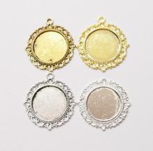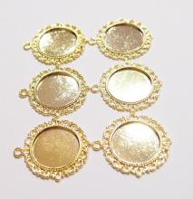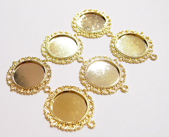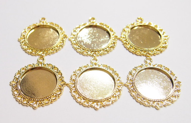 You are buying 6 of 20 mm Round Shiny Gold Plated 4 Loops Pendant Settings. These are very well made and sturdy. You will not be disappointed in the quality, it is excellent and if I was setting any cameos or cabs, I would use these. The outside measures 30 mm in diameter. The top has a nice size loop (2.6 mm) for your Chain or Cord or Jump Ring (which I have 3 Colors & 2 Sizes of). Since they are a solid back, you could go down in size a little if you had an odd size cameo or cabochon to try & fit. These are lightweight & sturdy. The backs of these have a basket weave pattern. I have lots of Great Bails, Bracelets, Cameos, Chains, Connectors, Jump Rings, Lockets, Pendants, Pins, Rings & Settings so, just look at all my listings. I have these in 3 other Colors & in a group of 4 Colors as shown in the last picture item #113766855584, sold separately. I have several other round settings in lots of styles & Colors. I have this same pattern in 25x18 & 40x30 mm Settings.