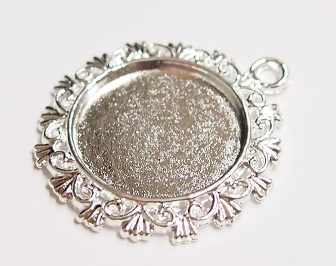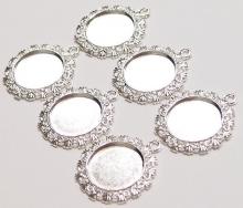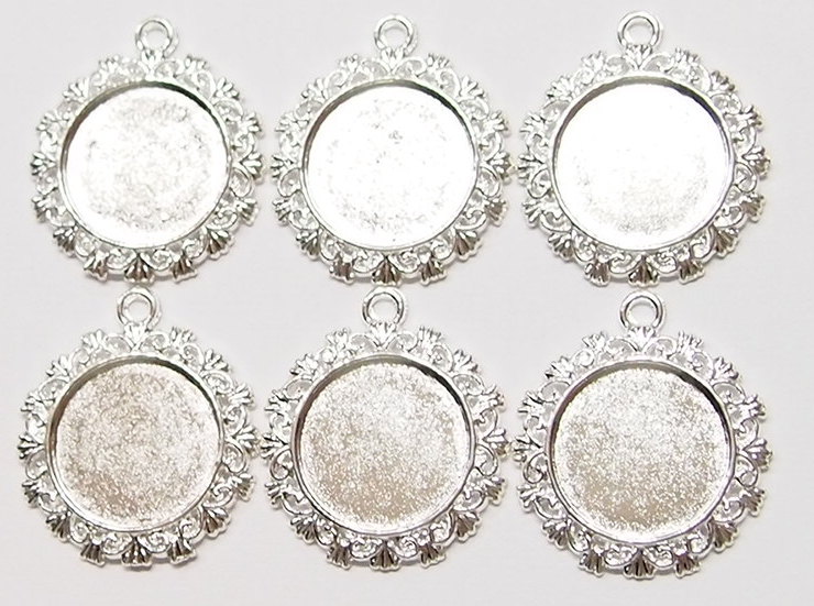You are buying 6 of 20 mm Round Shiny Silver Plated Crown Pendant Settings. These measure 30 mm in the outer diameter. The top has a nice size loop (3.2 mm) for your Chain or Cord or Jump Ring (which I have 3 Colors & 2 Sizes of). These are lightweight & sturdy. Since they are a solid back, you could go down in size a little if you had an odd size cameo or cabochon to try & fit. These have a Crown design all around the outside edge of these gorgeous settings. These are very well made. You will not be disappointed in the quality, it is excellent and if I was setting any cameos, cabochons, or glass, I would use these. Cameos or cabochons will have to be glued in, no prongs. I have lots of Great Bails, Bracelets, Cameos, Chains, Connectors, Jump Rings, Lockets, Pendants, Pins, Rings & Settings so, just look at all my listings. I also have these in Antique Silver item #110911243307.