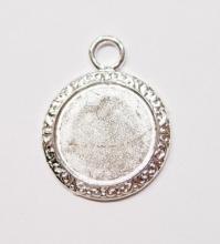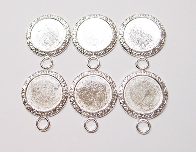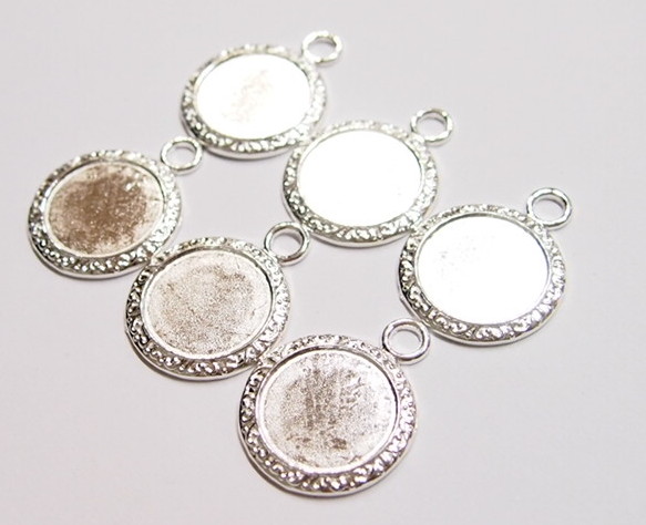 You are buying 6 of 20 mm Round Shiny Silver Plated Scroll Edge Pendant Settings. These pendants have a Scroll edge for the design around the setting, & are very nice looking. The setting measures 20 mm & the outside measures 26 mm in diameter. The top has a nice size loop (4.7 mm) for your Chain or Cord or Jump Ring (which I have 3 Colors & 2 Sizes of). Since they are a solid back, you could go down in size a little if you had an odd size cameo, cab or coin to try & fit. You will not be disappointed in the quality, it is excellent and if I was setting any cameos or cabs, I would use these. The backside has a small lip and you could put up to 24 mm cameos/cab or coins there & you could have a double sided pendant. Cabs or Cameos or Coins will have to be glued in, no prongs. I have lots of Great Bails, Bracelets, Cameos, Chains, Connectors, Jump Rings, Lockets, Pendants, Pins, Rings & Settings so, just look at all my listings. I have these in 3 other Colors & in a group of 4 Colors as shown in the last picture item #111638286209.