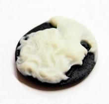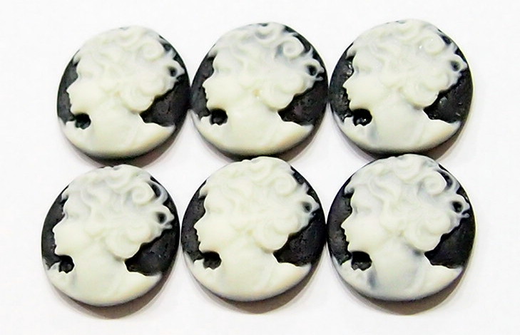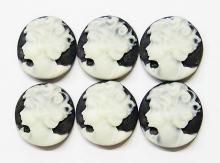 You are buying 6 of 20 mm Round White over Black Left Facing Woman Cameos. They show a woman Facing Left in a striking pose. The details are very sharp and stand away from the background, giving it a 3-D effect. The molding process of these are just great, no flaws. She is white on a black background. I have several different gorgeous settings these will fit in. These measure 20 mm round. They look very detailed for their size. I have lots of Great Bails, Bracelets, Cameos, Chains, Connectors, Jump Rings, Lockets, Pendants, Pins, Rings & Settings so, just look at all my listings. I have this same Cameo in a White over Brown as shown in the next to last picture item #360471679671. The last picture shows the 4 Colors of 20 mm Round Settings that i offer item #111638286209. They are all listed individually in groups of 6 of each Color.