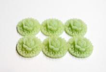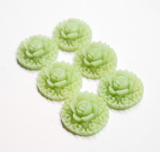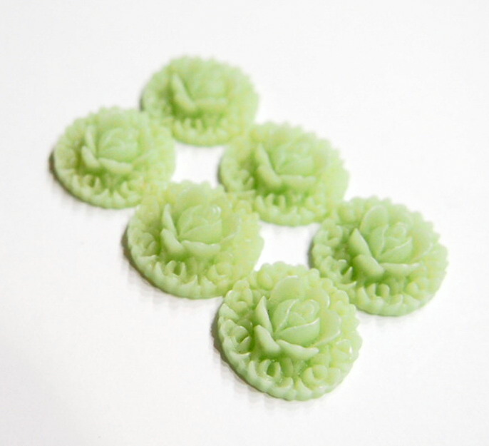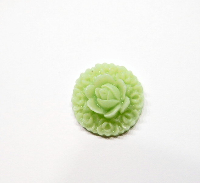 You are buying 6 of 21 mm Round Pale Green Layers of Roses Cameos. These are really nice, they show a layer of rose that ends up in the middle as a large rose, made of acrylic. The color is a pale green. The molding process of these are just great, no flaws. I have several different settings these will fit in. They look very detailed for their size. I have lots of Great Bails, Bracelets, Cameos, Chains, Connectors, Jump Rings, Lockets, Pendants, Pins, Rings & Settings so, just look at all my listings. I have these in several other Colors.