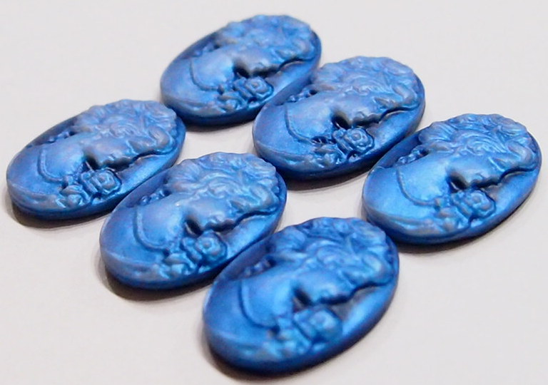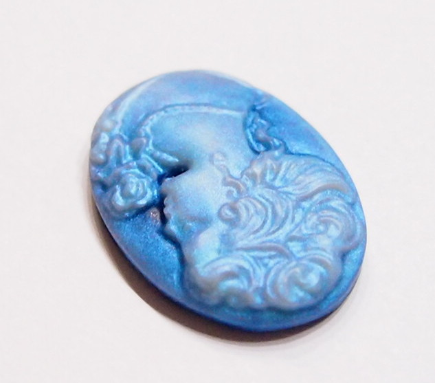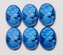 You are buying 6 of 23 mm x 17 mm Blue over Blue Rose Corsage & Pearls Woman Cameos. They are of a beautiful Woman with her hair up, a wisp of hair hanging down in back and looking toward the right with a corsage. The cameo is Light Blue that blends into a Darker Blue. This is an older style cameo. They measure 23 mm x 17 mm. These will fit fine in any 25x18 mm setting you will just have to center it. They look very detailed for their size. I have lots of Great Bails, Bracelets, Cameos, Chains, Connectors, Pendants, Pins, Rings & Settings so, just look at all my listings. I also have these in white over brown that measure 24x18 mm.