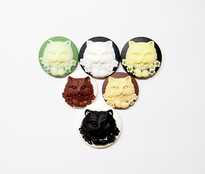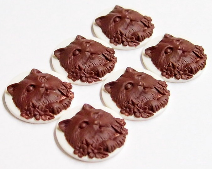 You are buying 6 of 25 mm Round Brown over White Cute Cat Cameos. This cat is just gorgeous with its little paws in front and the tongue just out of its mouth, these are very cute. These are Brown with a floral pattern around her or him on a White background. They look very detailed for their size, in fact, they stand out from the background to give it a 3-D look. They measures 25 mm round and fit into the 25 mm pendants, (which I have listed in 4 Colors), just perfect. I have the cats in a 29 mm too. I have lots of Great Bails, Bracelets, Cameos, Chains, Connectors, Jump Rings, Lockets, Pendants, Pins, Rings & Settings so, just look at all my listings. I have these in 1 other Color, Cream over Brown item #110911243298. I also offer a group of 6 Cat Cameos as shown in the last picture item #360471675604.