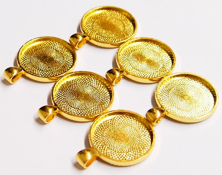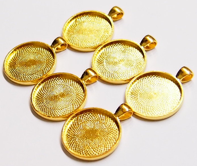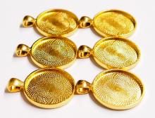 You are buying 6 of 25 mm Round Shiny Gold Plated Deep Band Pendant Settings, for Cameos, Cabs, or Coins. These pendants have a deep band (2 mm) and a nice size bail (4 x 6 mm) to hold whatever you put in them. These settings are originally from the 1900-1930's, I only had a few left and found a company to make these for me and they are gorgeous. The design is very nice and they are solid, not flimsy like the new ones are. You will not be disappointed in the quality, it is excellent and if I was setting any cameos, cabochons, glass, coins, or whatever you want, I would use these. I have lots of Great Bails, Bracelets, Cameos, Chains, Connectors, Jump Rings, Lockets, Pendants, Pins, Rings & Settings so, just look at all my listings. I have these in 3 other Colors & in a group of 4 Colors as shown in the next to last picture item #360944247964, sold separately. I have this same design in a 40x30 mm pendant settings in 4 Colors as shown in the last picture item #112531883053, sold separately.