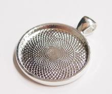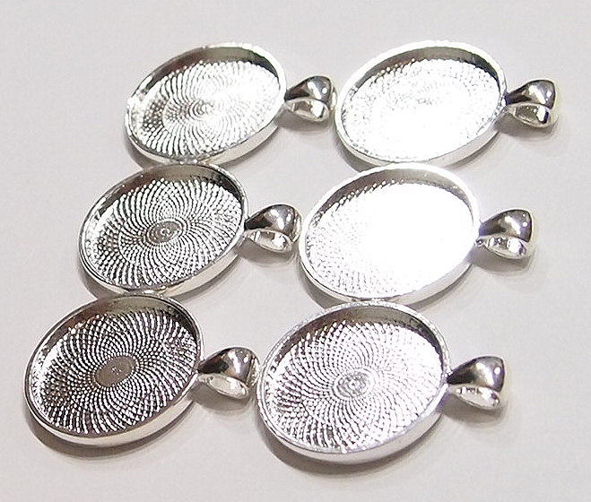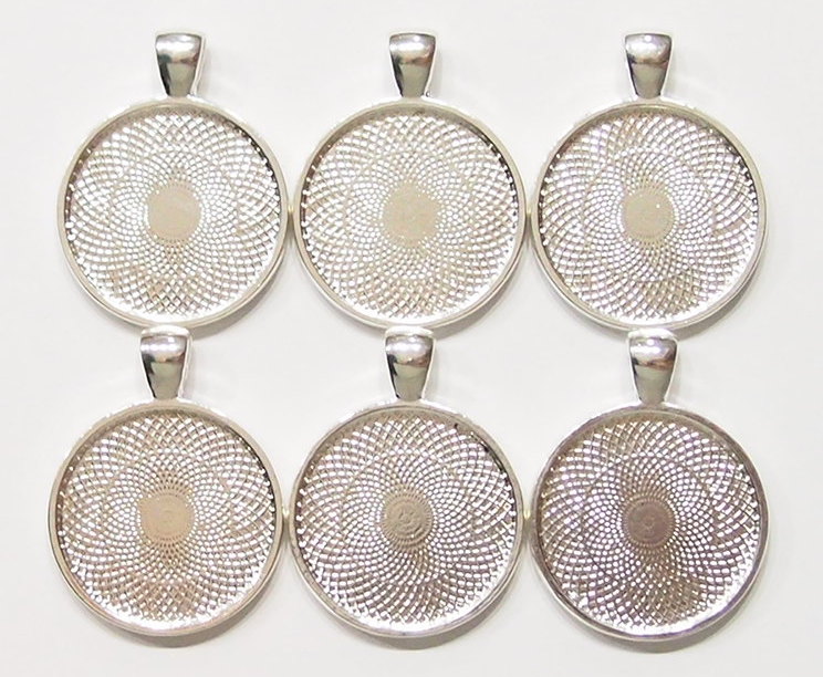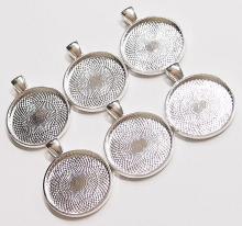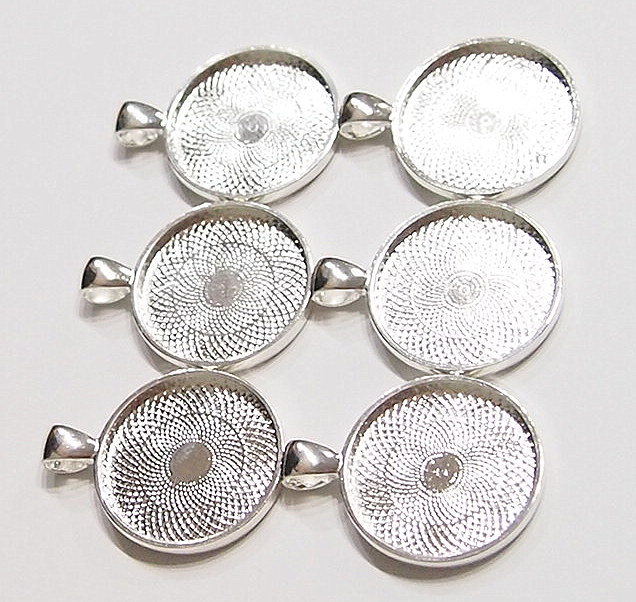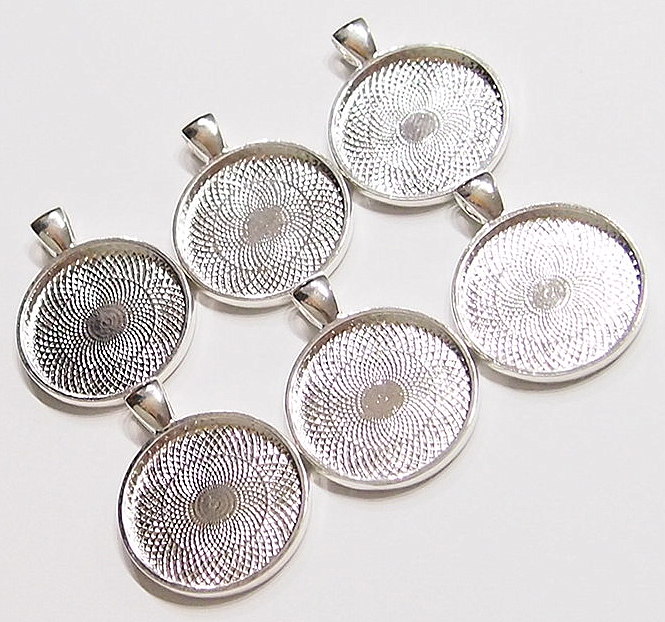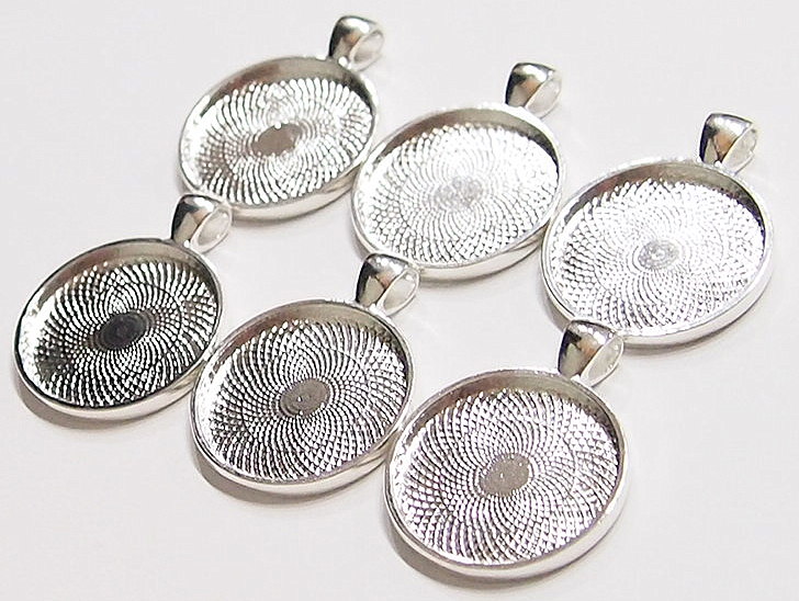 You are buying 6 of 25 mm Round Shiny Silver Plated Deep Band Pendant Settings, for Cameos, Cabs, Glass or Coins. These pendants have a deep band (2 mm) and a nice size bail (4 x 6 mm) to hold whatever you put in them. These settings are originally from the 1900-1930's, I only had a few left and found a company to make these for me and they are gorgeous. The design is very nice and they are solid, not flimsy like the new ones are. You will not be disappointed in the quality, it is excellent and if I was setting any cameos, cabochons, glass, coins, or whatever you want, I would use these. I have lots of Great Bails, Bracelets, Cameos, Chains, Connectors, Jump Rings, Lockets, Pendants, Pins, Rings & Settings so, just look at all my listings. I have these in 3 other Colors & in a group of 4 Colors as shown in the next to last picture item #360944247964. I have this same design in a 40x30 mm pendant settings in 4 Colors as shown in the last picture item #112531883053, sold separately.