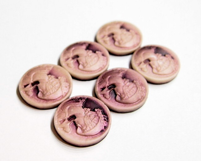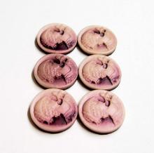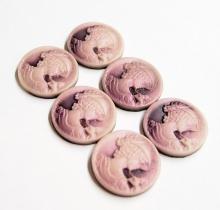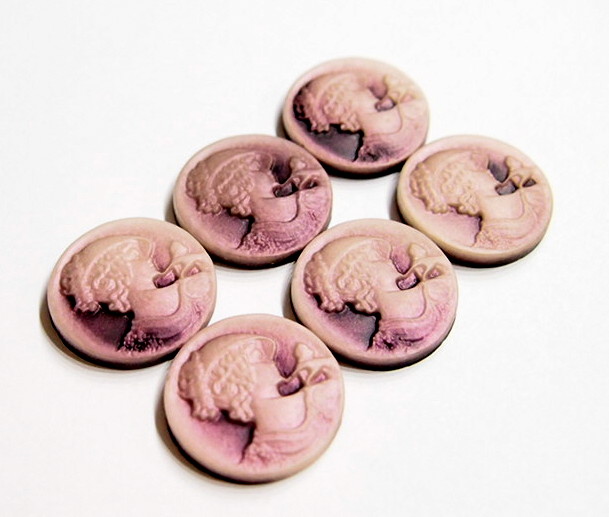 You are buying 6 of 25 mm Round White that Fades into a iridescent Purple Hat Lady Cameos. They are of a beautiful Victorian Woman with a hat on & her finger on her Chin. They measure 25 mm round. They look very detailed for their size. I have lots of Great Bails, Bracelets, Cameos, Chains, Connectors, Jump Rings, Lockets, Pendants, Pins, Rings & Settings so, just look at all my listings. I have several 25 mm Round Settings that these look great in.