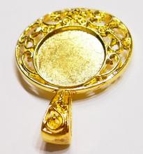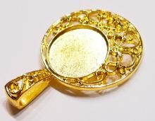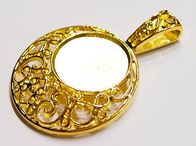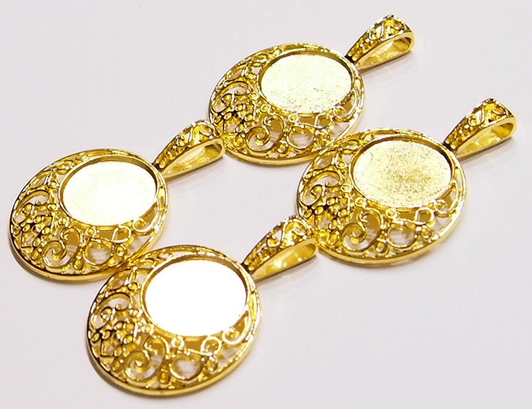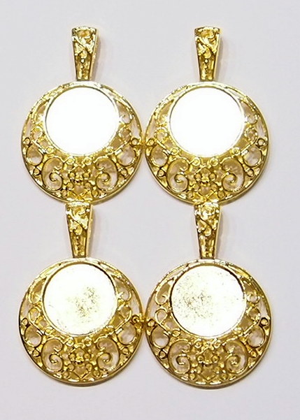 You are buying 4 of 25 mm Round Shiny Gold Plated Large Decorative with Big Bail Pendant Settings. The pendant is a nice size measuring 65 x 44 mm outside and has a unique design that will flatter anything you put in it. You will not be disappointed in the quality, it is excellent and if I was setting any cameos, cabochons, glass, or whatever you want, I would use these. These have a large bail that will fit any Chain or Cord. Since they are a solid back, you could go down in size a little if you had an odd size cameo or cab to try & fit. Cameos or cabochons will have to be glued in, no prongs. I have lots of Great Bails, Bracelets, Cameos, Chains, Connectors, Jump Rings, Lockets, Pendants, Pins, Rings & Settings so, just look at all my listings. I have these in 3 other Colors & in a group of 4 Colors as shown in the last picture item #112470424983, sold separately.