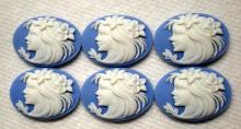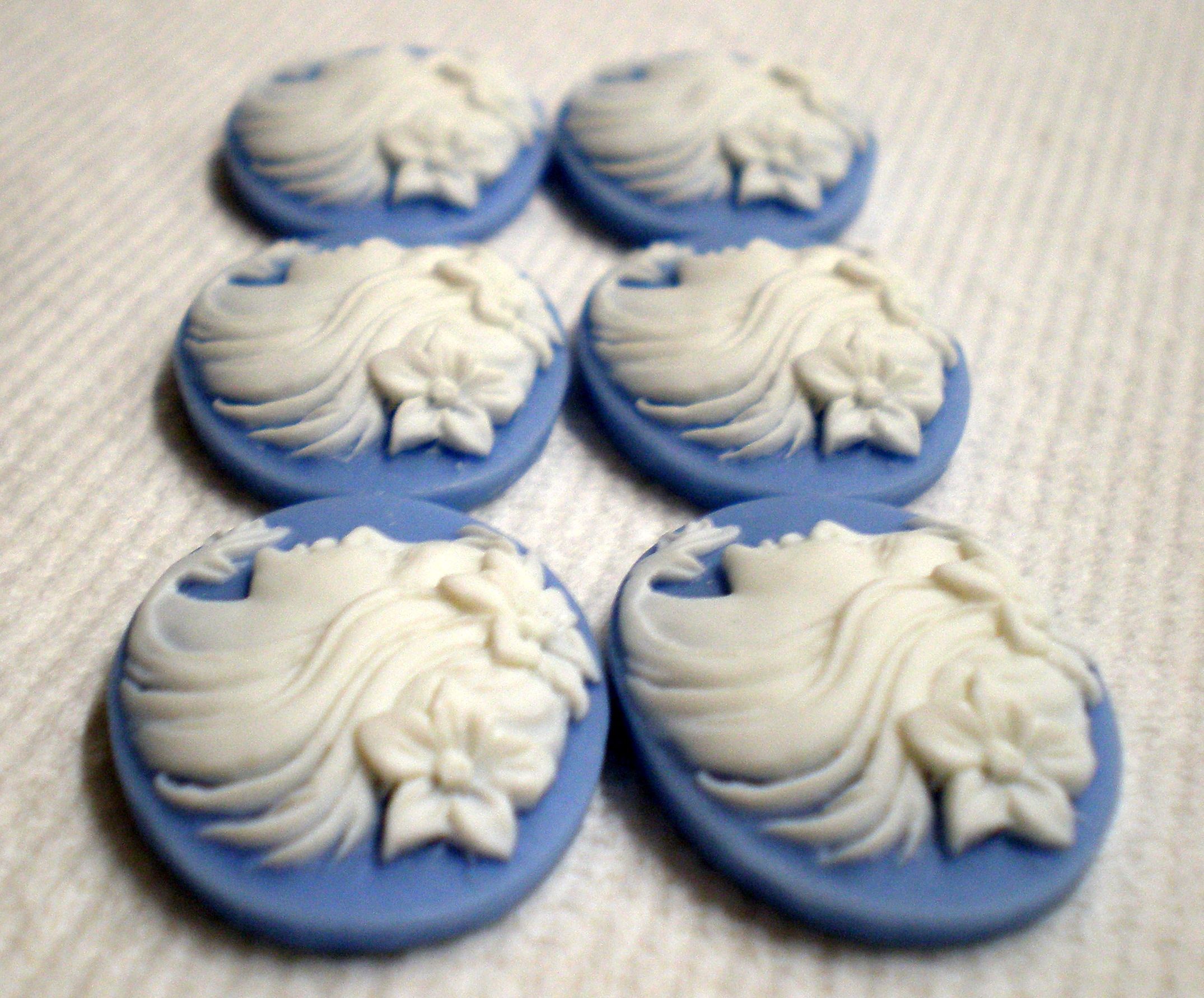 You are buying 6 Vintage Molded Resin Cameos. They are of a Beautiful Young Woman facing Left with flowers in her hair. The Woman stands out from the cameo to give you the 3-d effect. They are a White color to a Blue color background, the contrast is very pretty between the two colors. They measure 25 mm x 18 mm. They look very detailed for their size. I have lots of great cameos, settings, connectors and pendants so, just look at all my listings.