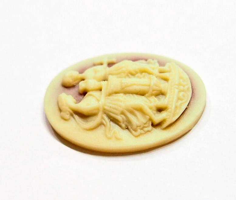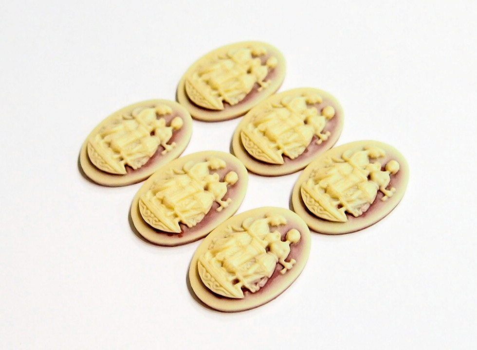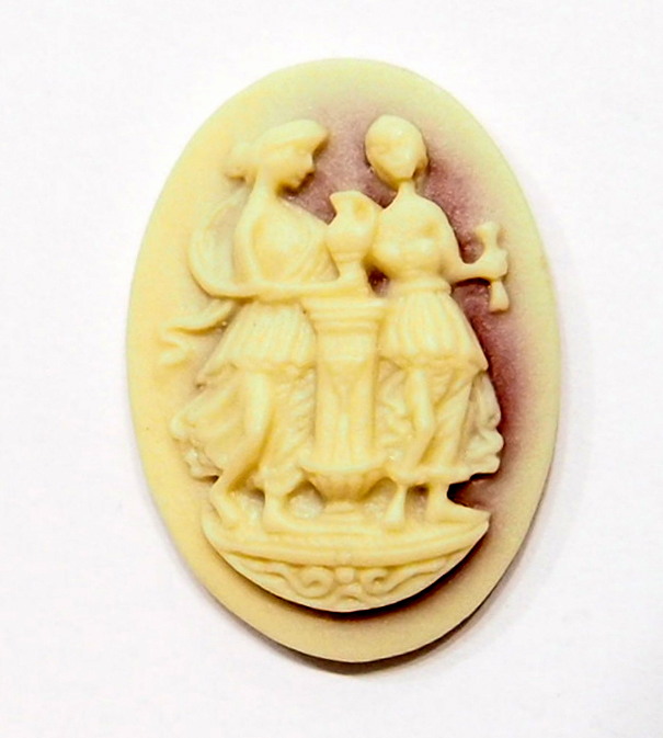 You are buying 6 Vintage Molded Resin Cameos. They are of a Victorian 2 Graces or 2 Muses from Mythology. Each one stands out from the cameo and is ivory in color, the background is 2 tone brown color. They are standing beside an urn on a pillar. They measure 25 mm x 18 mm. They look very detailed for their size. I have lots of great cameos, settings, connectors and pendants so, just look at all my listings.