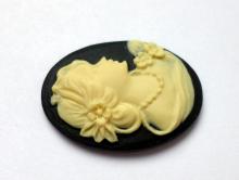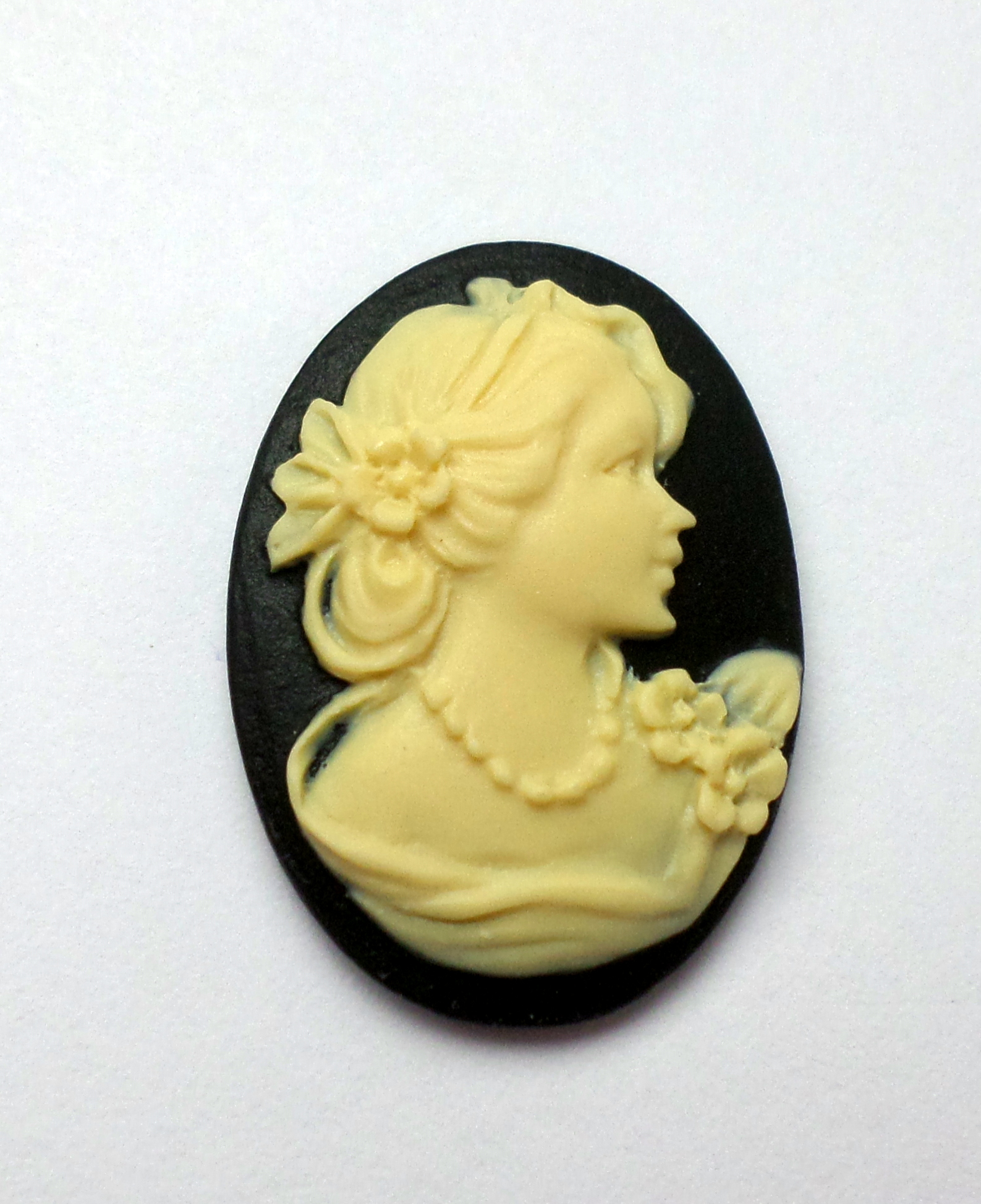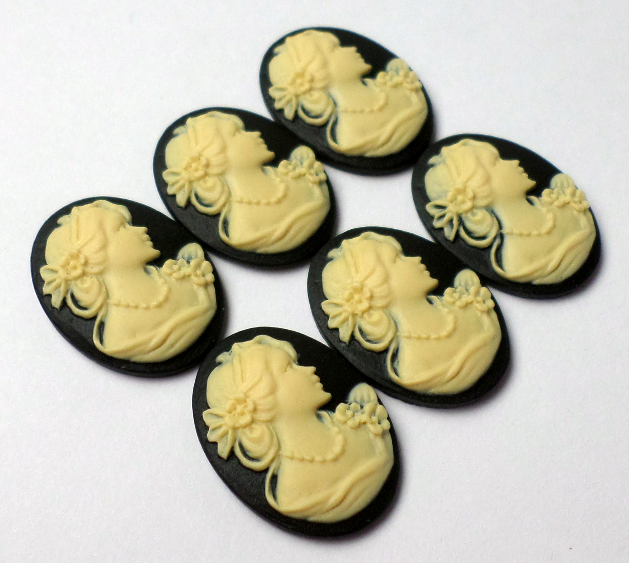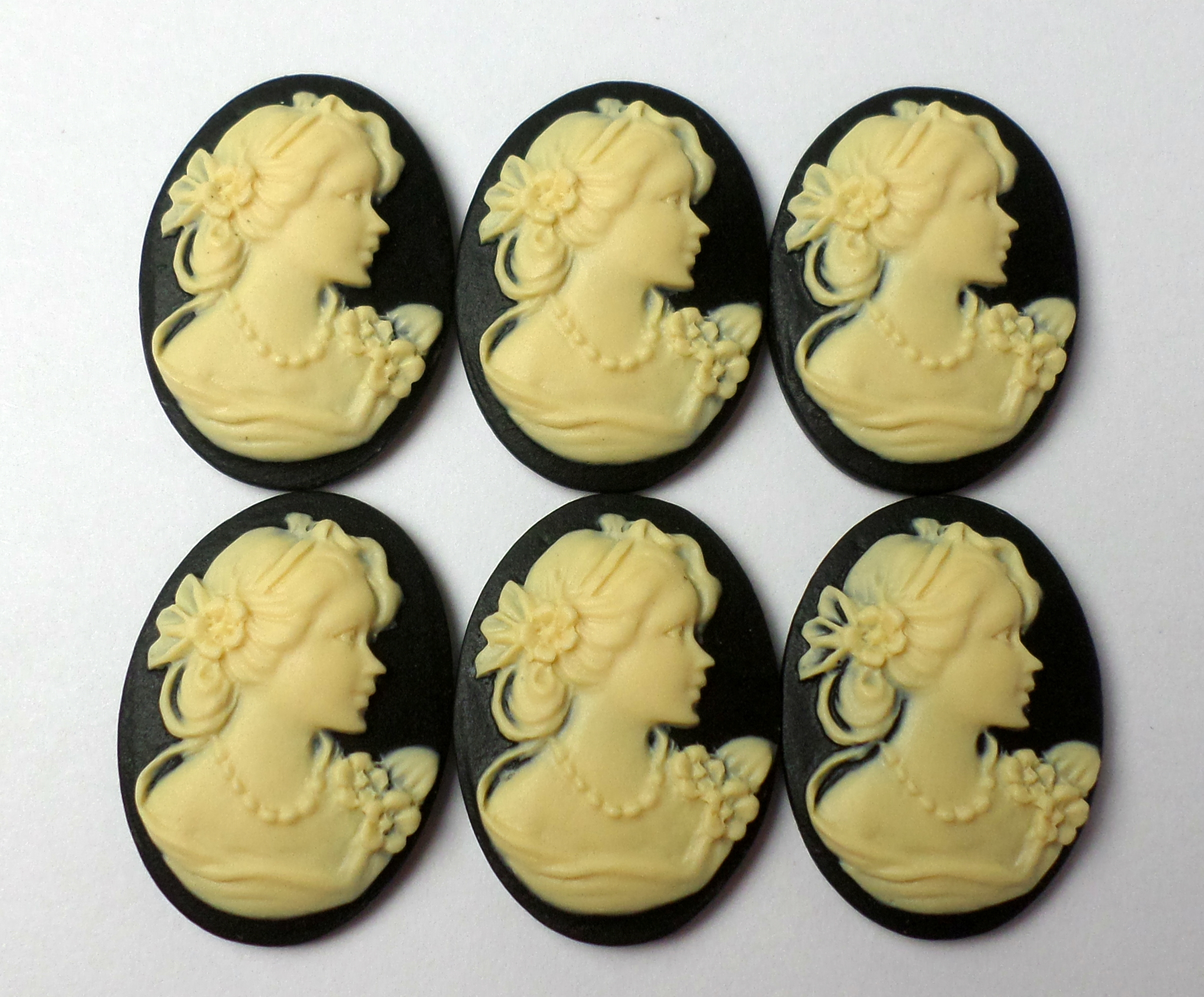 You are buying 6 of 25 mm x 18 mm Cream over Black Victorian Style Corsage & Pearls Cameos. These are of a beautiful Woman with her hair up and looking toward the right with a corsage. She has a pearl necklace, and wearing a low cut gown. The cameo is Cream over a Black color Background. These are fashioned after the older style of Cameos. They measure 25x18 mm. They look very detailed for their size. I have lots of Great Bails, Bracelets, Cameos, Chains, Connectors, Jump Rings, Lockets, Pendants, Pins, Rings & Settings so, just look at all my listings. I have these in 5 other Colors & in a group of 6 different Colors for a total of 6 gorgeous 25x18 mm Cameos as shown in the next to last picture item #361510316187. I also offer a group of 10 different 25x18 mm beautiful Grecian Women Cameos as shown in the last picture item #360935670102.