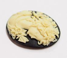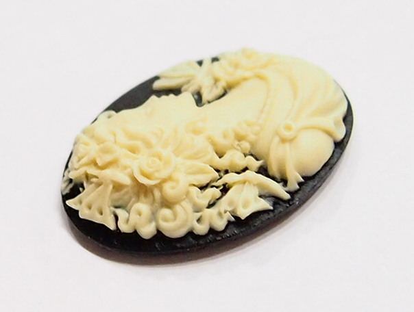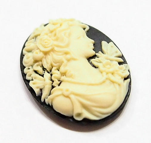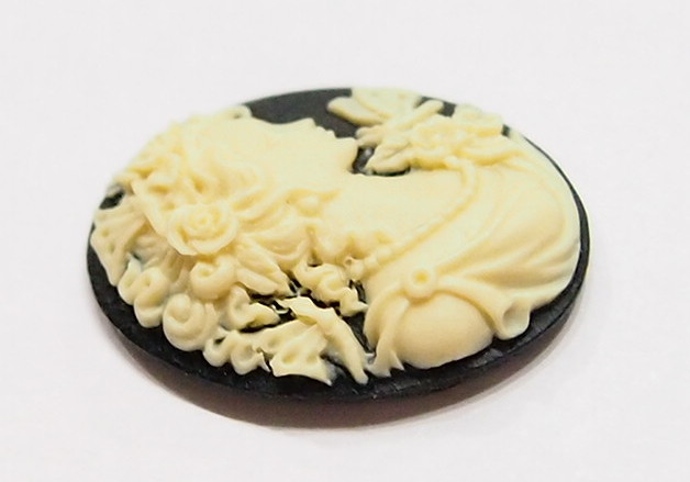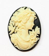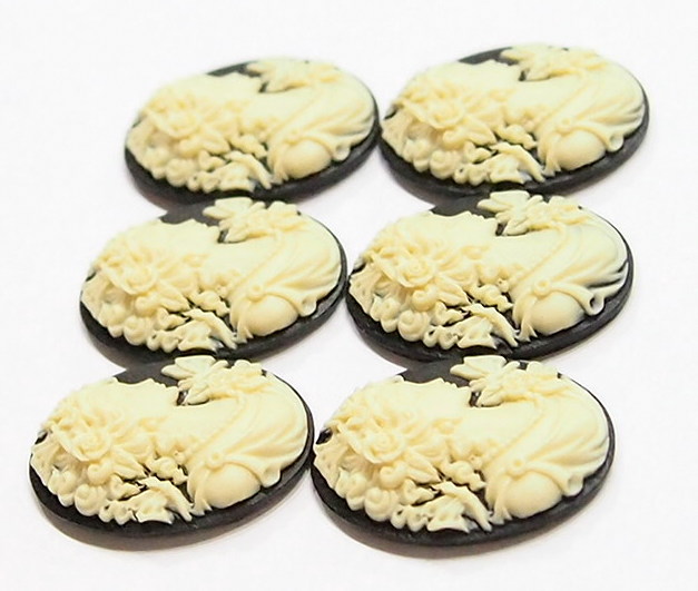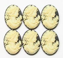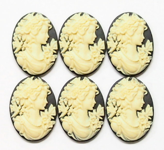 You are buying 6 of 25 mm x 18 mm Cream over Black Grecian Butterfly Woman Cameos. These are so gorgeous, this shows a beautiful Mythology Muse or Grecian woman in a gown with her hair up and her hairband is all floral with roses and a butterfly. She is wearing a pearl necklace and her gown has a floral accent too, they are perfect. The woman is Cream over a Black color background. The molding process of these are just great, no flaws. These measure 25 mm x 18 mm. I have several different settings these will fit in. These are pretty fabulous. The details are very sharp and stand away from the background, giving it a 3-D effect. I have lots of Great Bails, Bracelets, Cameos, Chains, Connectors, Jump Rings, Lockets, Pendants, Pins, Rings & Settings so, just look at all my listings. These are also offered in a group of 10 different Colors as shown in the next to last picture item #360935670102. Also offered in 40x30 mm with 3 Colors of Gorgeous Cameos as shown in the last picture is item #111104064150.