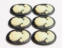 You are buying 6 of 25 mm x 18 mm Cream over Black Short Hair Shy Lady Cameos. These are so gorgeous, this shows a beautiful Victorian woman in a cream color on a background of Black. She is just stunning. The molding process of these are just great, no flaws. I have several different settings these will fit in. They fit into the 25x18 mm settings I have listed. These are pretty fabulous. They look very detailed for their size. I have lots of Great Bails, Bracelets, Cameos, Chains, Connectors, Jump Rings, Lockets, Pendants, Pins, Rings & Settings so, just look at all my listings. I also have these in cream over brown & in 3 Colors of 40x30 mm.