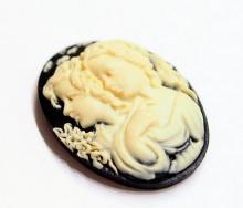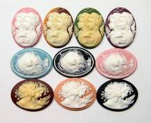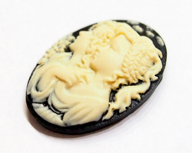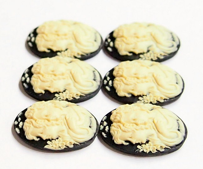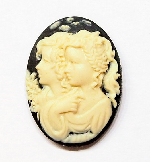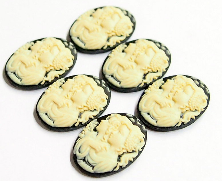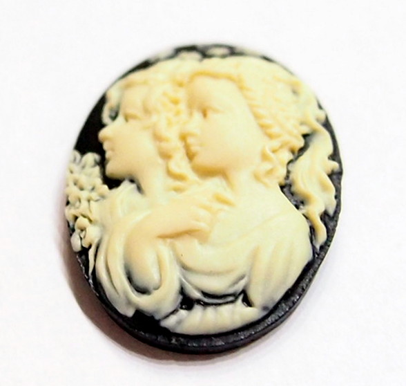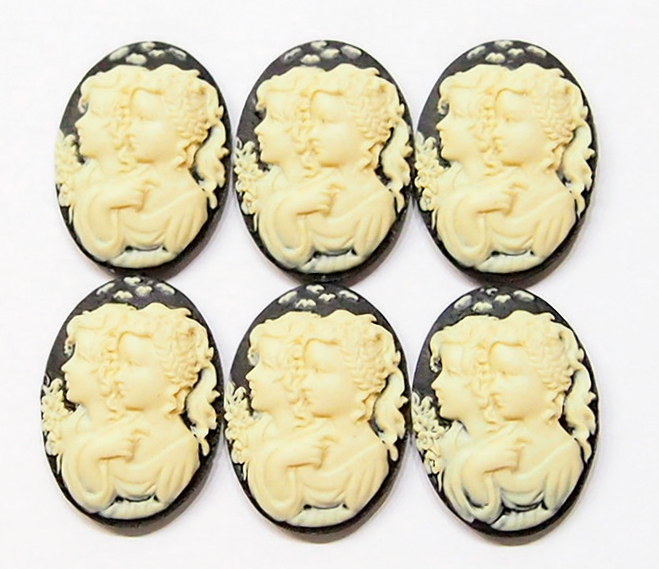 You are buying 6 of 25 mm x 18 mm Sisters Mother or Daughter Cameos Cream over Black. They are of sisters, or mother and daughter, either one, the molding is very well done. These are a gorgeous Cream color over Black Background. These measure 25x18 mm. They look very detail for their size, in fact, they stand out from the background to give it a 3-D look. I have lots of Great Bails, Bracelets, Cameos, Chains, Connectors, Jump Rings, Lockets, Pendants, Pins, Rings & Settings so, just look at all my listings. I also have these in a group of 10 Colors in 40x30 mm as shown in the last picture item #111175420451, sold separately.