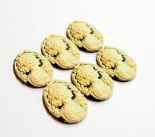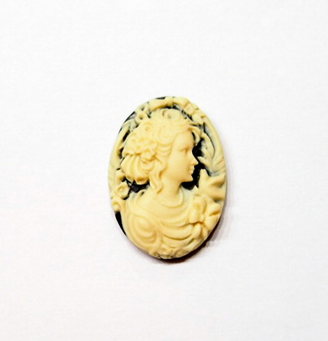You are buying 6 of 25 mm x 18 mm Cream over Black Victorian Lady Floral Design Edges Cameos. These are so gorgeous, this shows a beautiful Victorian Woman with floral designs all around the edges of the cameo. She is Right Facing & Cream on a Black Background. The Woman practically fills up the entire cameo by herself. The details are very sharp and stand away from the background, giving it a 3-D effect. The molding process of these are just great, no flaws. I have several different settings these will fit in. They measure 25 mm x 18 mm. They look very detailed for their size. I have lots of Great Bails, Bracelets, Cameos, Chains, Connectors, Jump Rings, Lockets, Pendants, Pins, Rings & Settings so, just look at all my listings. I also offer a group similar to this cameo in 6 Colors in 25x18 mm Victorian Corsage and Pearls Women as shown in the next to last picture item #361510316187, sold separately. These are also offered in a group of 10 different 25x18 mm gorgeous cameos as shown in the last picture item #360935670102, sold separately.