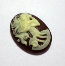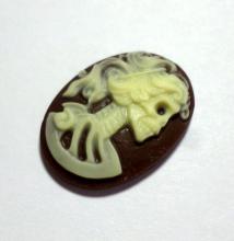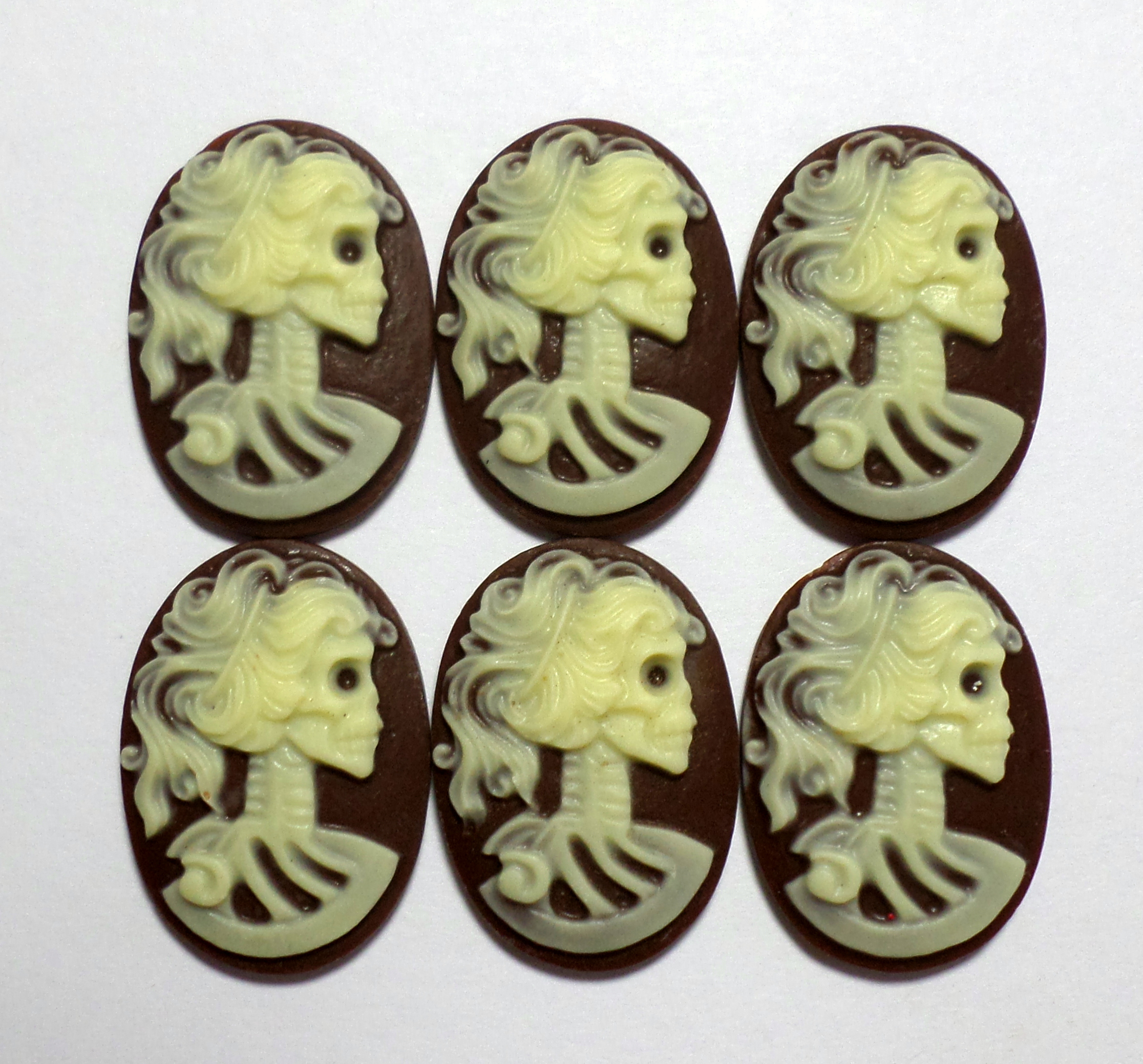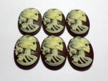 You are buying 6 of 25 mm x 18 mm Cream over Brown Zombie Skeleton Lady Cameos. These measure 25 x 18 mm and are of a Lady Skeleton Zombie Queen, I think she is strange, but cool in a way, the molding is very well done. They are a Cream over a Brown Background. They look very detailed for their size, in fact, they stand way out from the background to give it a 3-D look. They have never been used. I have lots of Great Bails, Bracelets, Cameos, Chains, Connectors, Jump Rings, Lockets, Pendants, Pins, Rings & Settings so, just look at all my listings. I have these in 5 other Colors & in a group of 6 Colors as shown in the next to last picture item #360731980581. I also have several Colors of these in 40x30 mm and in a group of 8 different Colors item #111608549279 as shown in the last picture.