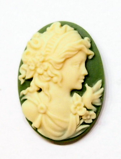 You are buying 6 of 25 mm x 18 mm Cream over Green Classic Grecian Bird & Floral Woman Cameos. These are so gorgeous, this shows a beautiful Classic Grecian woman in a Cream color over a Green Background. She is just stunning. The molding process of these are just great, no flaws. She has floral surrounding her with a low cut gown on and a bird in the floral design. They fit into the 25 mm x 18 mm settings I have listed. These are pretty fabulous and they look very detailed for their size. I have lots of Great Bails, Bracelets, Cameos, Chains, Connectors, Jump Rings, Lockets, Pendants, Pins, Rings & Settings so, just look at all my listings. I have these in 1 other Color & are included in a group of 10 Colors as shown in the last picture item #360935670102 and are sold separately. I have most of these in 40x30 mm also & in groups.